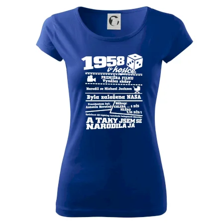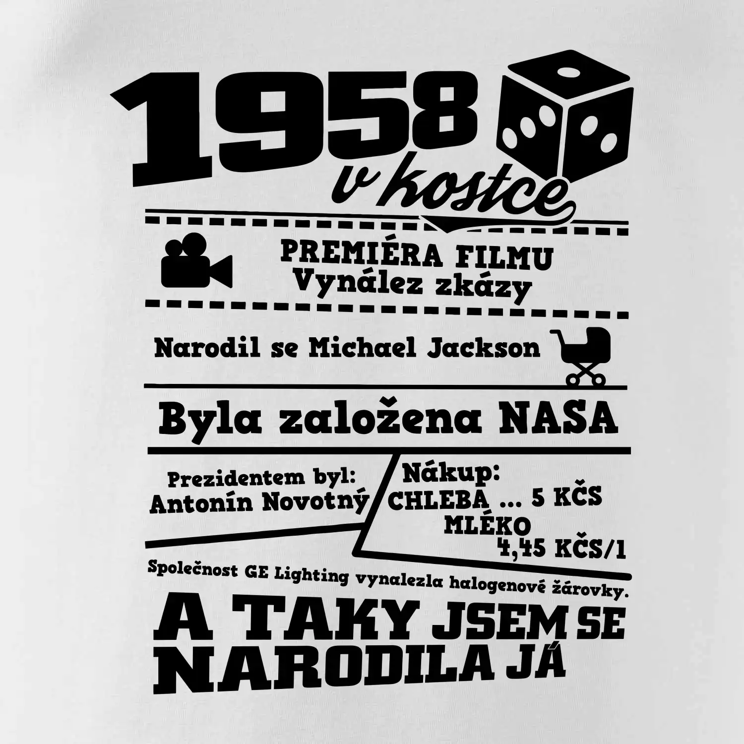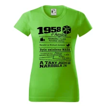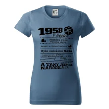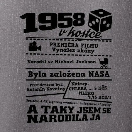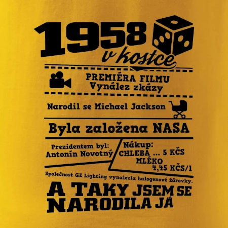 Narozeninové tričko pro ročník 1958. Sháníš originální dárek? Triko pro ročník 1958 v kostce je ten nejlepší dárek, kterým jistě potěšíš. Kolik co stálo? Kdo byl prezident? Kdo se narodil? Všechno tohle a ještě mnohem víc najdeš na našem oslaveneckém triku!