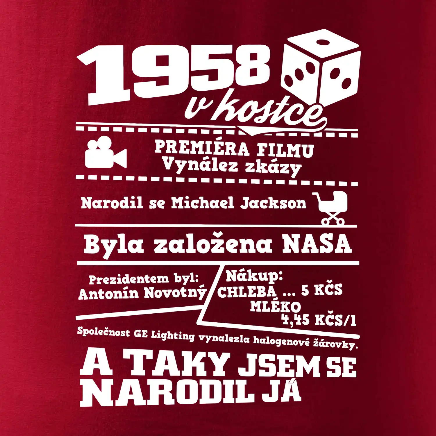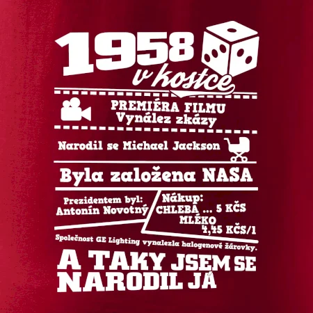 Narozeninové tričko pro ročník 1958. Sháníš originální dárek? Triko pro ročník 1958 v kostce je ten nejlepší dárek, kterým jistě potěšíš. Kolik co stálo? Kdo byl prezident? Kdo se narodil? Všechno tohle a ještě mnohem víc najdeš na našem oslaveneckém triku!