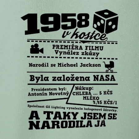 Narozeninové tričko pro ročník 1958. Sháníš originální dárek? Triko pro ročník 1958 v kostce je ten nejlepší dárek, kterým jistě potěšíš. Kolik co stálo? Kdo byl prezident? Kdo se narodil? Všechno tohle a ještě mnohem víc najdeš na našem oslaveneckém triku!