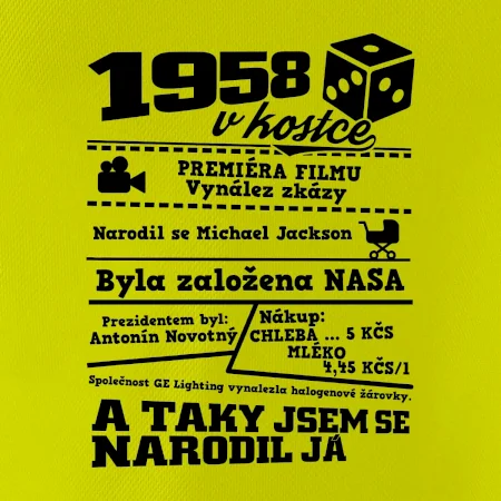 Narozeninové tričko pro ročník 1958. Sháníš originální dárek? Triko pro ročník 1958 v kostce je ten nejlepší dárek, kterým jistě potěšíš. Kolik co stálo? Kdo byl prezident? Kdo se narodil? Všechno tohle a ještě mnohem víc najdeš na našem oslaveneckém triku!