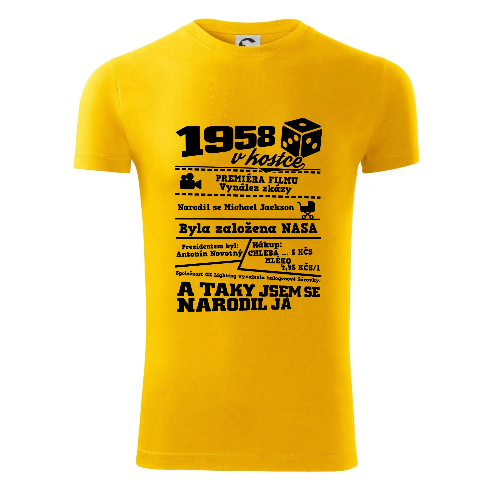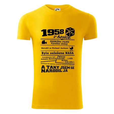 Narozeninové tričko pro ročník 1958. Sháníš originální dárek? Triko pro ročník 1958 v kostce je ten nejlepší dárek, kterým jistě potěšíš. Kolik co stálo? Kdo byl prezident? Kdo se narodil? Všechno tohle a ještě mnohem víc najdeš na našem oslaveneckém triku!