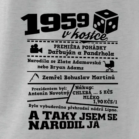 Narozeninové tričko pro ročník 1959. Sháníš originální dárek? Triko pro ročník 1959 v kostce je ten nejlepší dárek, kterým jistě potěšíš. Kolik co stálo? Kdo byl prezident? Kdo se narodil? Všechno tohle a ještě mnohem víc najdeš na našem oslaveneckém triku!