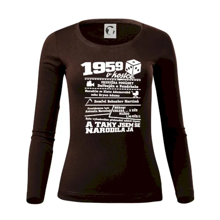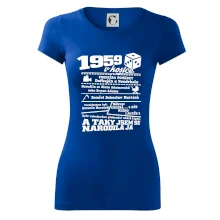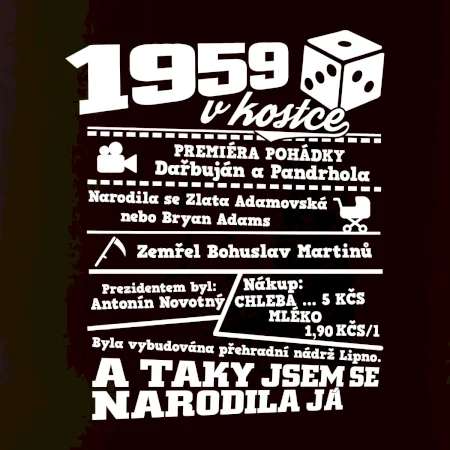 Narozeninové tričko pro ročník 1959. Sháníš originální dárek? Triko pro ročník 1959 v kostce je ten nejlepší dárek, kterým jistě potěšíš. Kolik co stálo? Kdo byl prezident? Kdo se narodil? Všechno tohle a ještě mnohem víc najdeš na našem oslaveneckém triku!