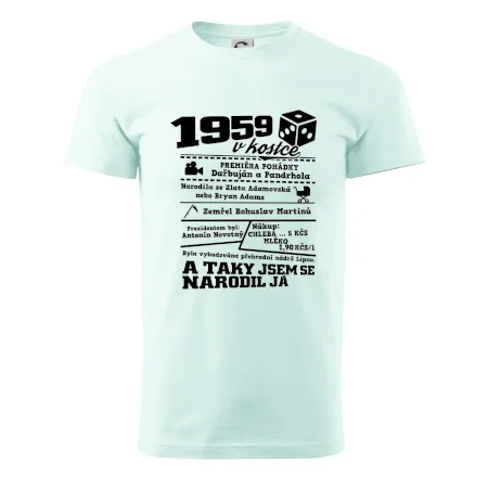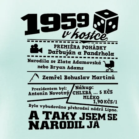 Narozeninové tričko pro ročník 1959. Sháníš originální dárek? Triko pro ročník 1959 v kostce je ten nejlepší dárek, kterým jistě potěšíš. Kolik co stálo? Kdo byl prezident? Kdo se narodil? Všechno tohle a ještě mnohem víc najdeš na našem oslaveneckém triku!