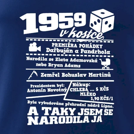 Narozeninové tričko pro ročník 1959. Sháníš originální dárek? Triko pro ročník 1959 v kostce je ten nejlepší dárek, kterým jistě potěšíš. Kolik co stálo? Kdo byl prezident? Kdo se narodil? Všechno tohle a ještě mnohem víc najdeš na našem oslaveneckém triku!