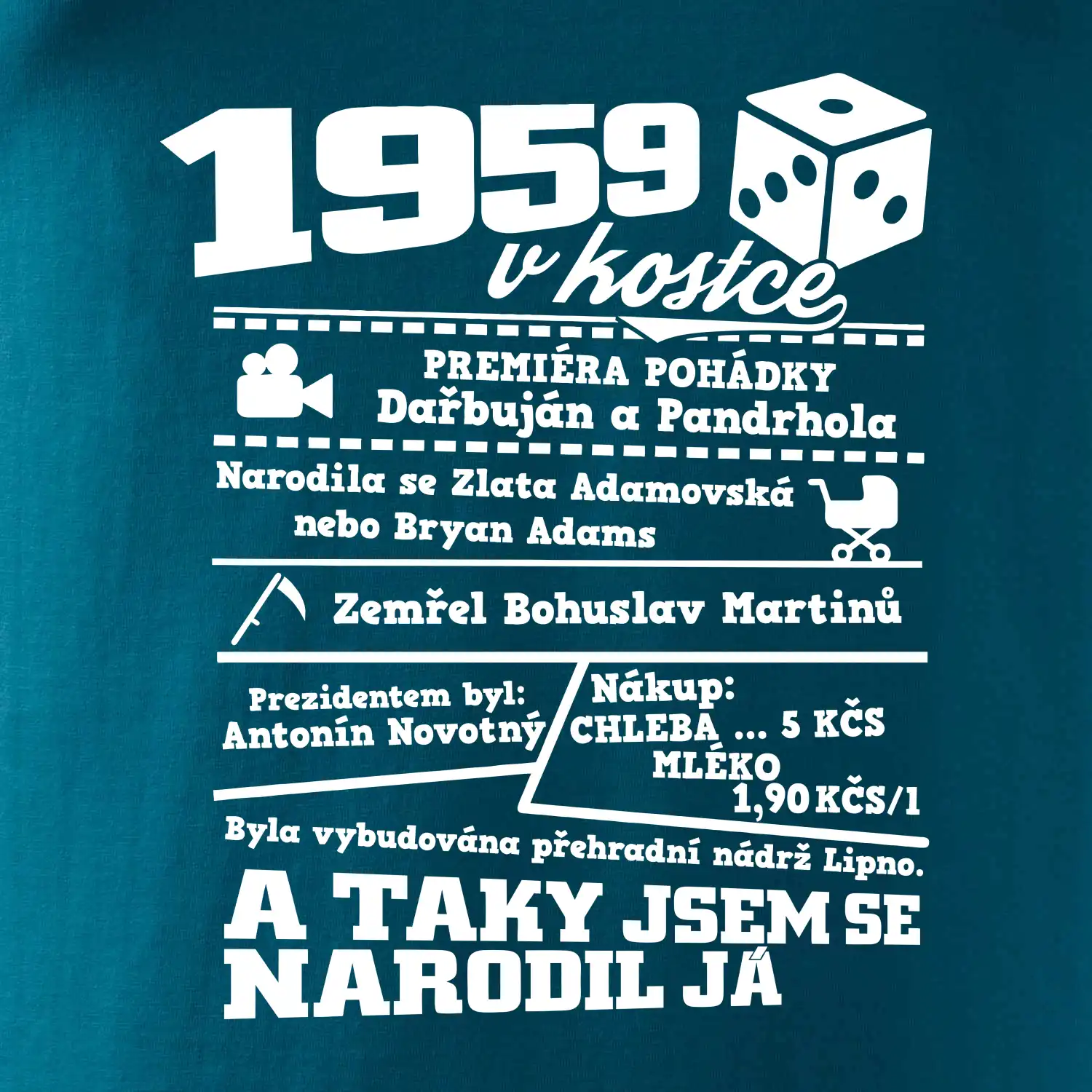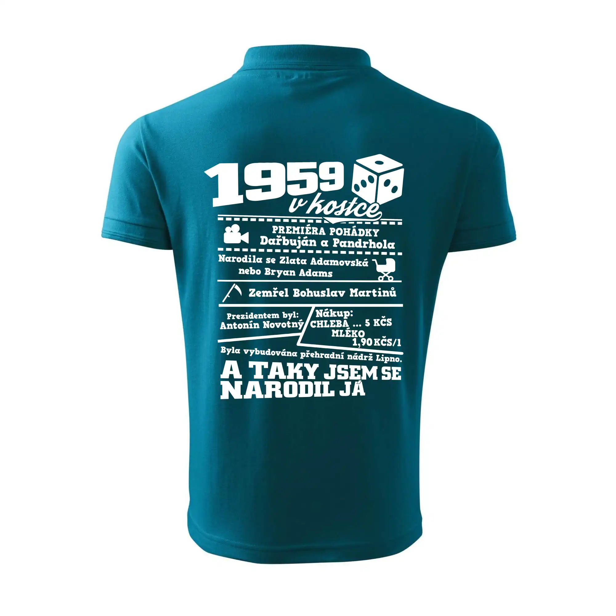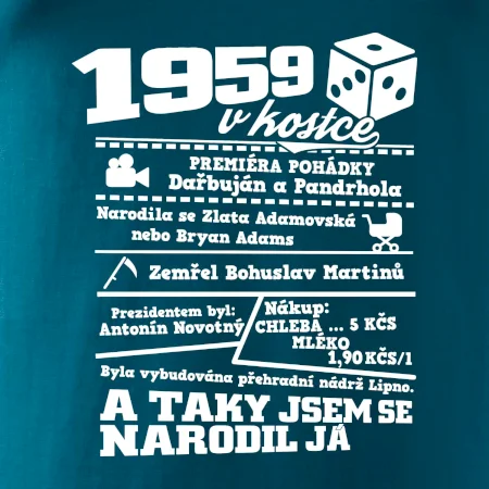 Narozeninové tričko pro ročník 1959. Sháníš originální dárek? Triko pro ročník 1959 v kostce je ten nejlepší dárek, kterým jistě potěšíš. Kolik co stálo? Kdo byl prezident? Kdo se narodil? Všechno tohle a ještě mnohem víc najdeš na našem oslaveneckém triku!