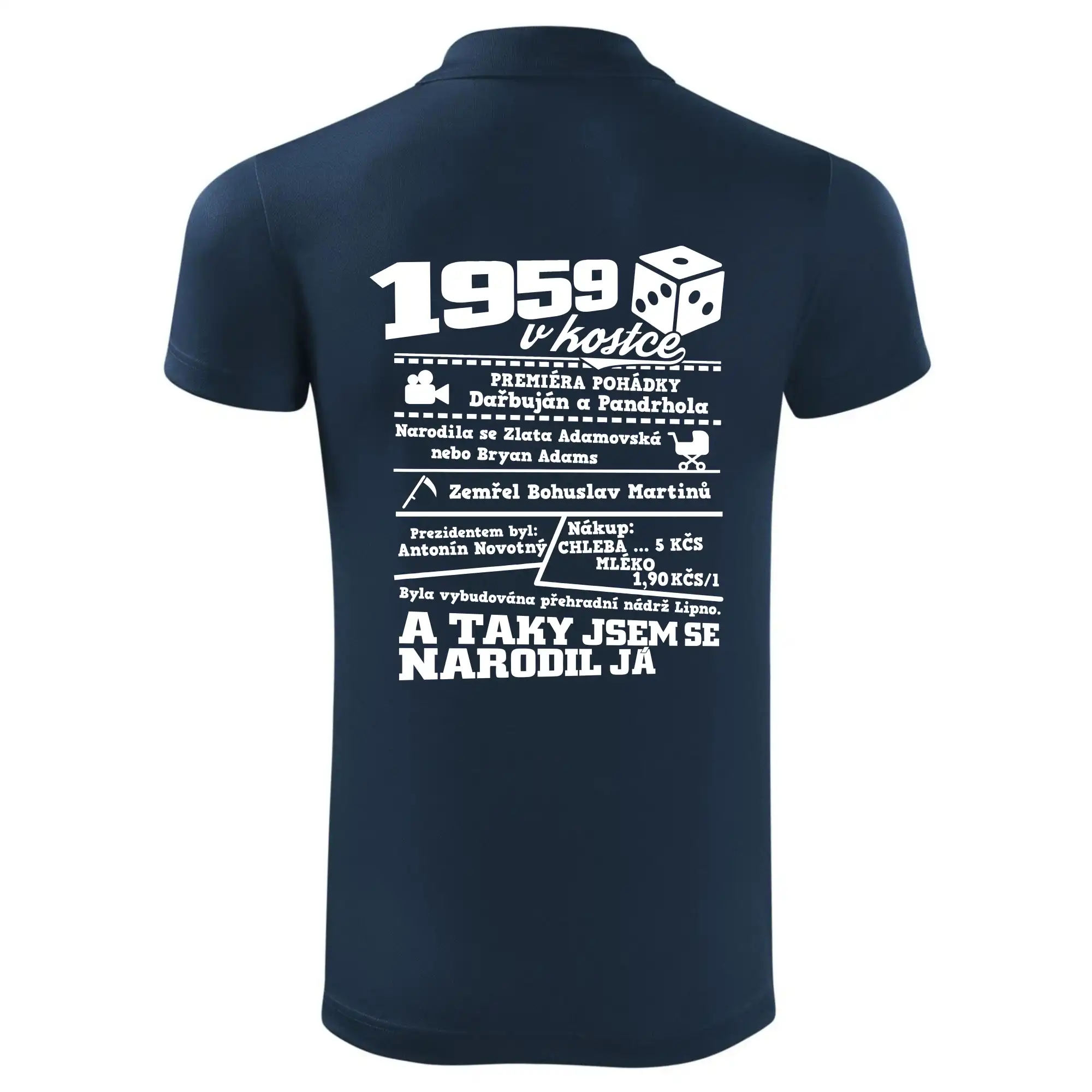 Narozeninové tričko pro ročník 1959. Sháníš originální dárek? Triko pro ročník 1959 v kostce je ten nejlepší dárek, kterým jistě potěšíš. Kolik co stálo? Kdo byl prezident? Kdo se narodil? Všechno tohle a ještě mnohem víc najdeš na našem oslaveneckém triku!