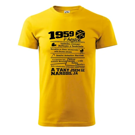 Narozeninové tričko pro ročník 1959. Sháníš originální dárek? Triko pro ročník 1959 v kostce je ten nejlepší dárek, kterým jistě potěšíš. Kolik co stálo? Kdo byl prezident? Kdo se narodil? Všechno tohle a ještě mnohem víc najdeš na našem oslaveneckém triku!