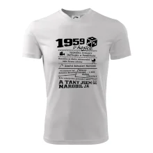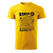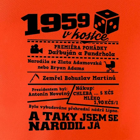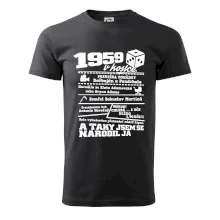 Narozeninové tričko pro ročník 1959. Sháníš originální dárek? Triko pro ročník 1959 v kostce je ten nejlepší dárek, kterým jistě potěšíš. Kolik co stálo? Kdo byl prezident? Kdo se narodil? Všechno tohle a ještě mnohem víc najdeš na našem oslaveneckém triku!