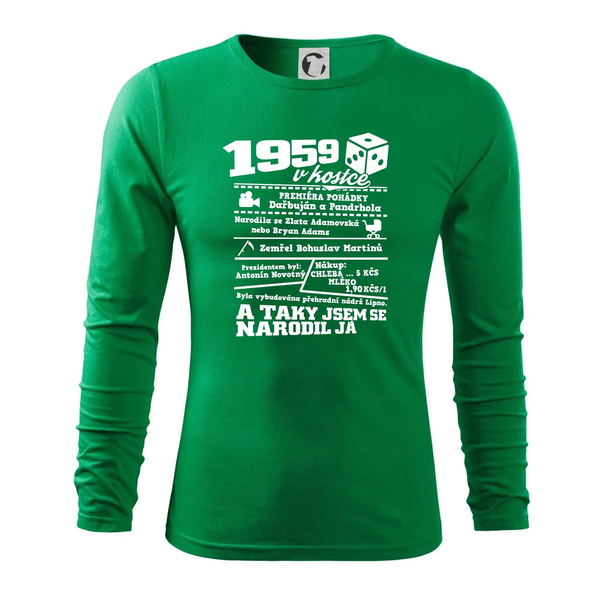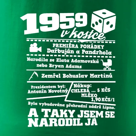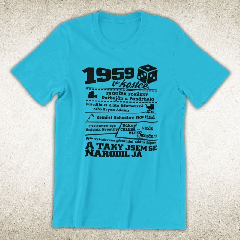 Narozeninové tričko pro ročník 1959. Sháníš originální dárek? Triko pro ročník 1959 v kostce je ten nejlepší dárek, kterým jistě potěšíš. Kolik co stálo? Kdo byl prezident? Kdo se narodil? Všechno tohle a ještě mnohem víc najdeš na našem oslaveneckém triku!