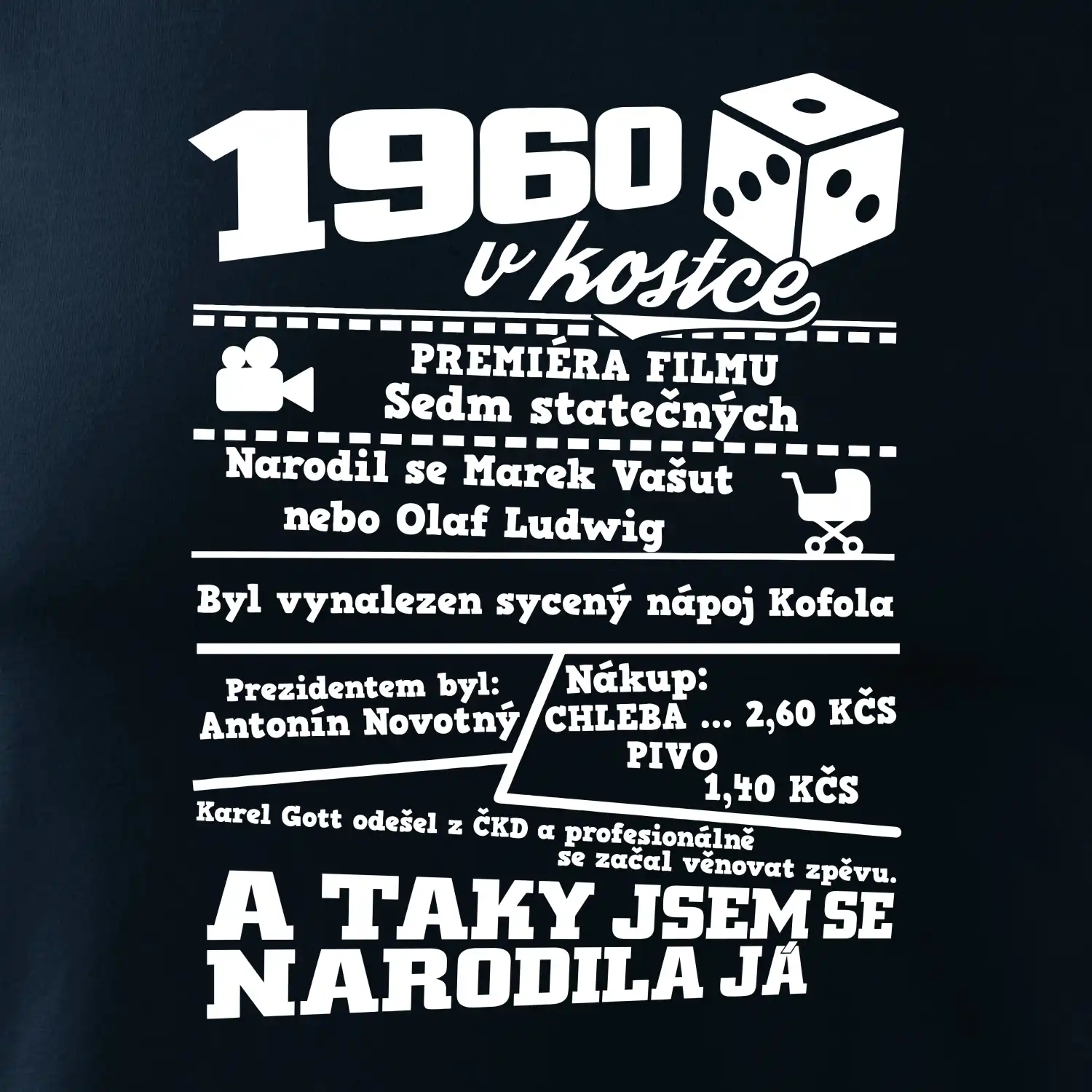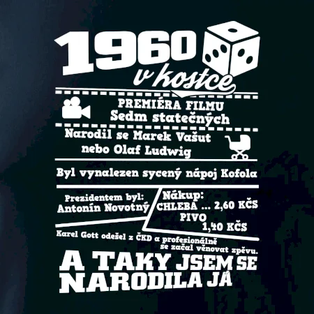 Narozeninové tričko pro ročník 1960. Sháníš originální dárek? Triko pro ročník 1960 v kostce je ten nejlepší dárek, kterým jistě potěšíš. Kolik co stálo? Kdo byl prezident? Kdo se narodil? Všechno tohle a ještě mnohem víc najdeš na našem oslaveneckém triku!