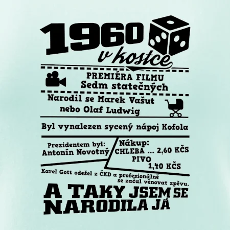 Narozeninové tričko pro ročník 1960. Sháníš originální dárek? Triko pro ročník 1960 v kostce je ten nejlepší dárek, kterým jistě potěšíš. Kolik co stálo? Kdo byl prezident? Kdo se narodil? Všechno tohle a ještě mnohem víc najdeš na našem oslaveneckém triku!