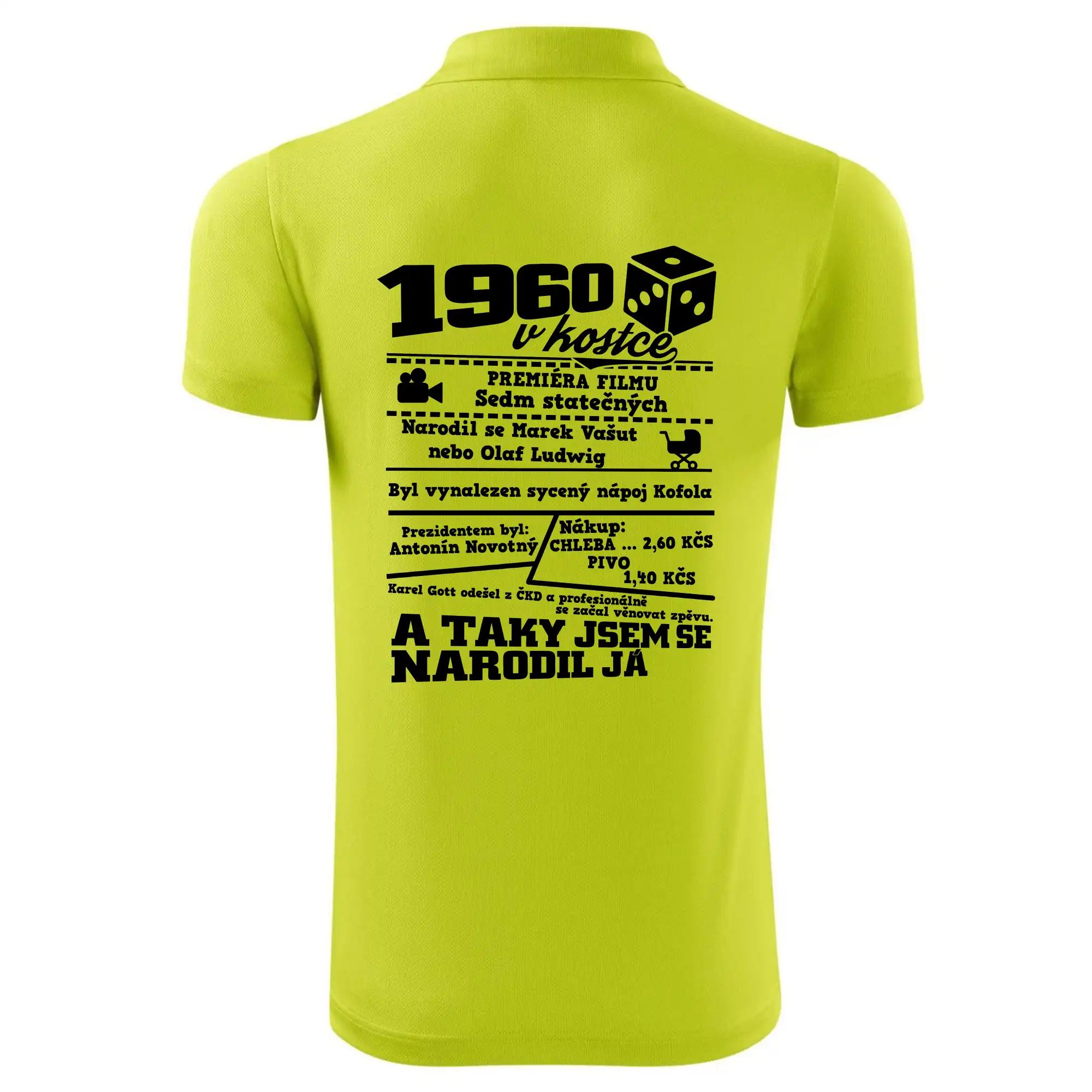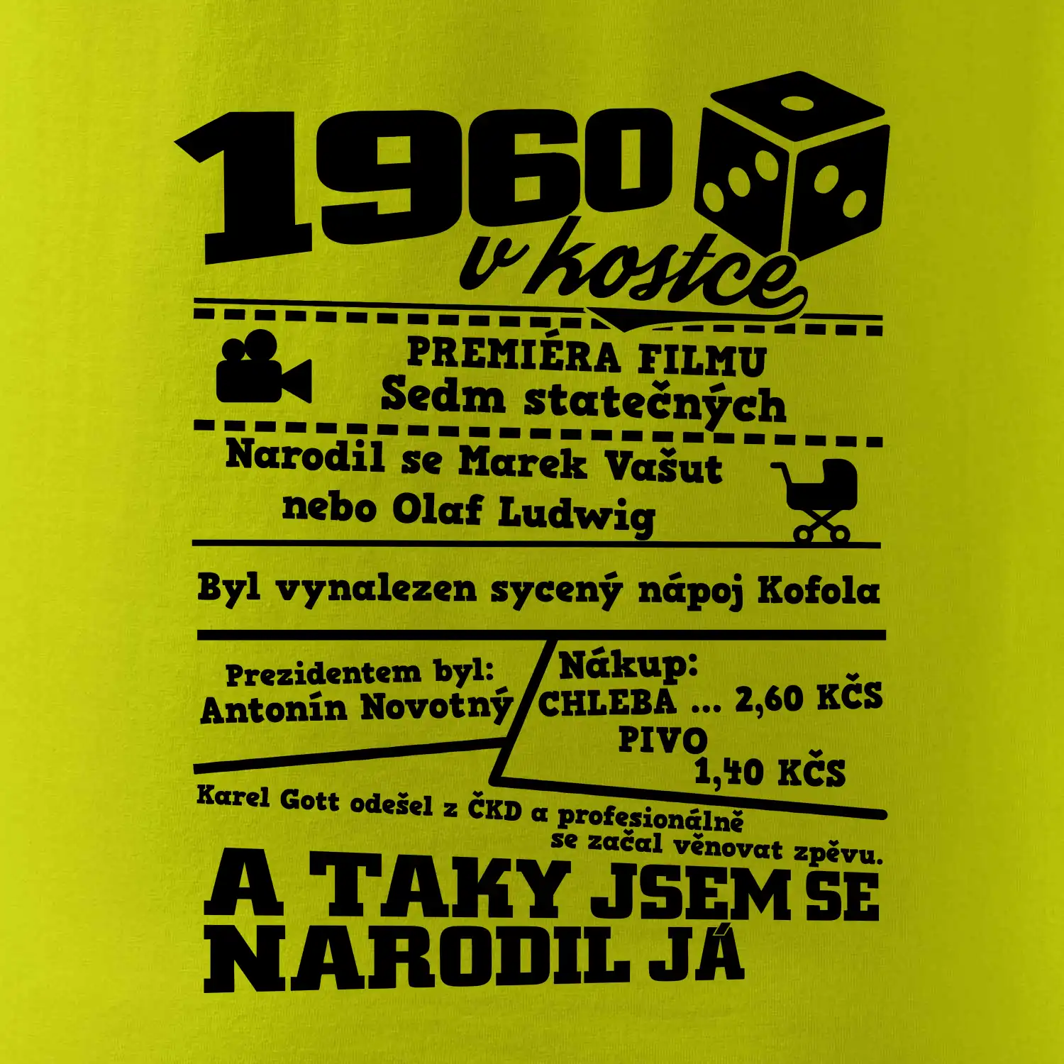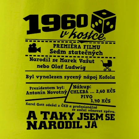 Narozeninové tričko pro ročník 1960. Sháníš originální dárek? Triko pro ročník 1960 v kostce je ten nejlepší dárek, kterým jistě potěšíš. Kolik co stálo? Kdo byl prezident? Kdo se narodil? Všechno tohle a ještě mnohem víc najdeš na našem oslaveneckém triku!