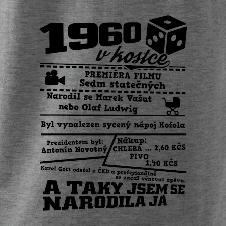 Narozeninové tričko pro ročník 1960. Sháníš originální dárek? Triko pro ročník 1960 v kostce je ten nejlepší dárek, kterým jistě potěšíš. Kolik co stálo? Kdo byl prezident? Kdo se narodil? Všechno tohle a ještě mnohem víc najdeš na našem oslaveneckém triku!