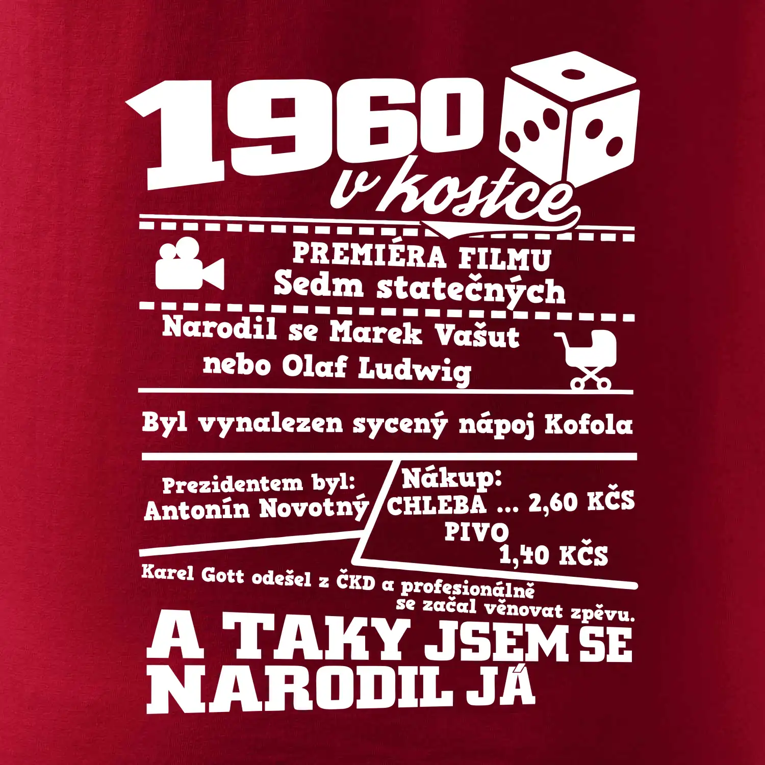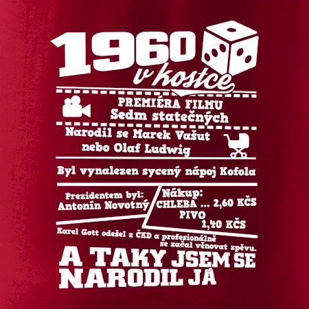 Narozeninové tričko pro ročník 1960. Sháníš originální dárek? Triko pro ročník 1960 v kostce je ten nejlepší dárek, kterým jistě potěšíš. Kolik co stálo? Kdo byl prezident? Kdo se narodil? Všechno tohle a ještě mnohem víc najdeš na našem oslaveneckém triku!