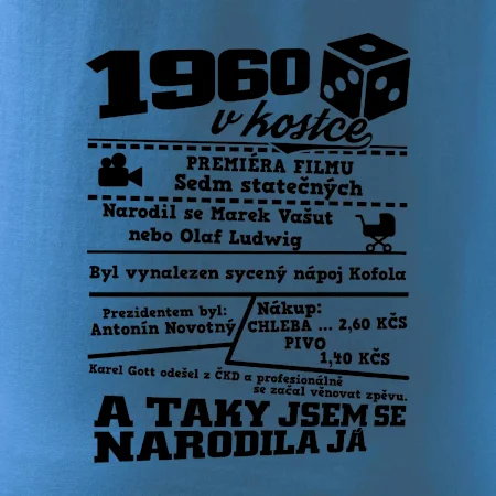 Narozeninové tričko pro ročník 1960. Sháníš originální dárek? Triko pro ročník 1960 v kostce je ten nejlepší dárek, kterým jistě potěšíš. Kolik co stálo? Kdo byl prezident? Kdo se narodil? Všechno tohle a ještě mnohem víc najdeš na našem oslaveneckém triku!