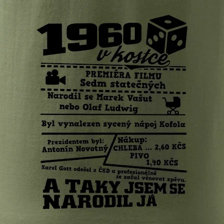 Narozeninové tričko pro ročník 1960. Sháníš originální dárek? Triko pro ročník 1960 v kostce je ten nejlepší dárek, kterým jistě potěšíš. Kolik co stálo? Kdo byl prezident? Kdo se narodil? Všechno tohle a ještě mnohem víc najdeš na našem oslaveneckém triku!