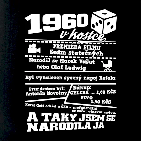 Narozeninové tričko pro ročník 1960. Sháníš originální dárek? Triko pro ročník 1960 v kostce je ten nejlepší dárek, kterým jistě potěšíš. Kolik co stálo? Kdo byl prezident? Kdo se narodil? Všechno tohle a ještě mnohem víc najdeš na našem oslaveneckém triku!