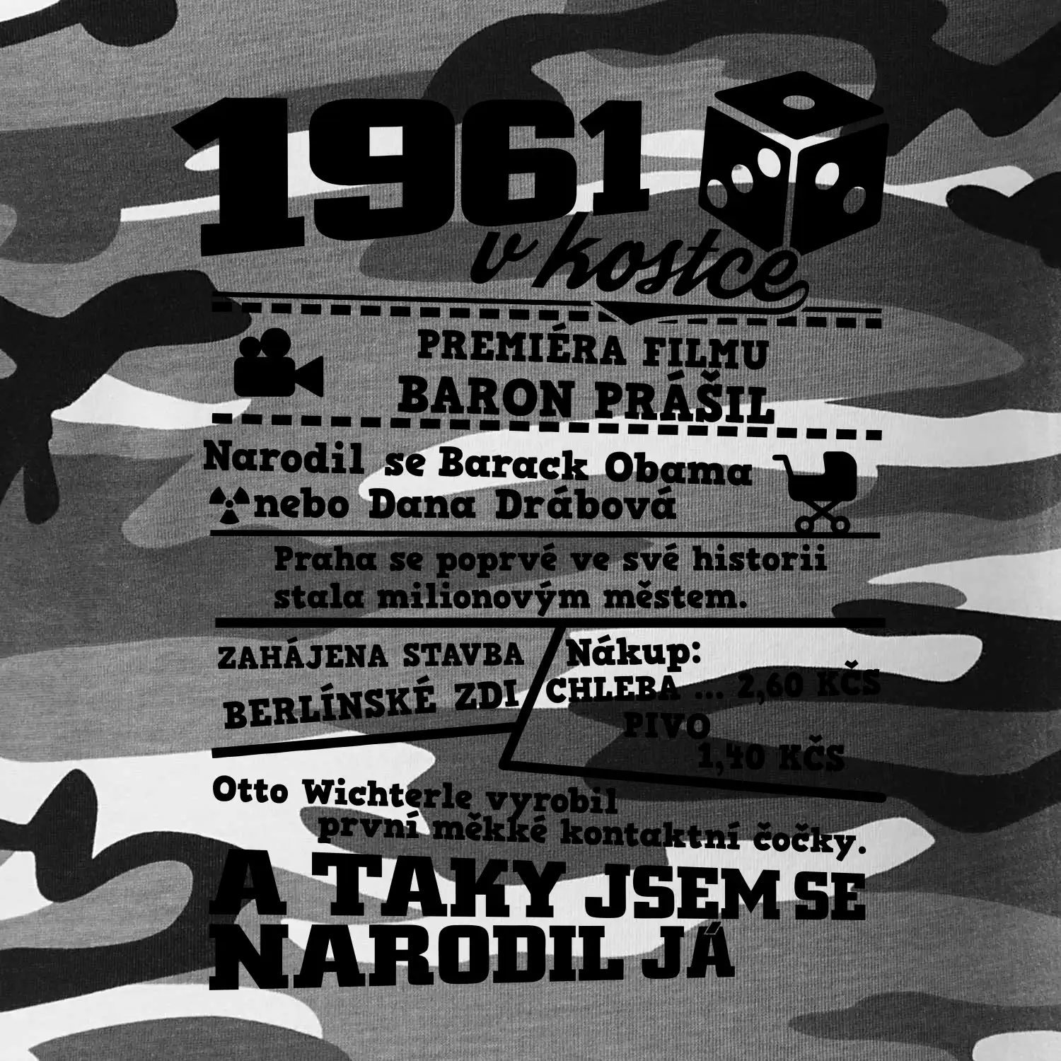 Narozeninové tričko pro ročník 1961. Sháníš originální dárek? Triko pro ročník 1961 v kostce je ten nejlepší dárek, kterým jistě potěšíš. Kolik co stálo? Kdo byl prezident? Kdo se narodil? Všechno tohle a ještě mnohem víc najdeš na našem oslaveneckém triku!