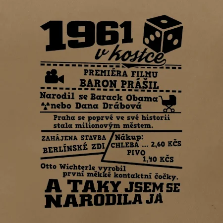 Narozeninové tričko pro ročník 1961. Sháníš originální dárek? Triko pro ročník 1961 v kostce je ten nejlepší dárek, kterým jistě potěšíš. Kolik co stálo? Kdo byl prezident? Kdo se narodil? Všechno tohle a ještě mnohem víc najdeš na našem oslaveneckém triku!