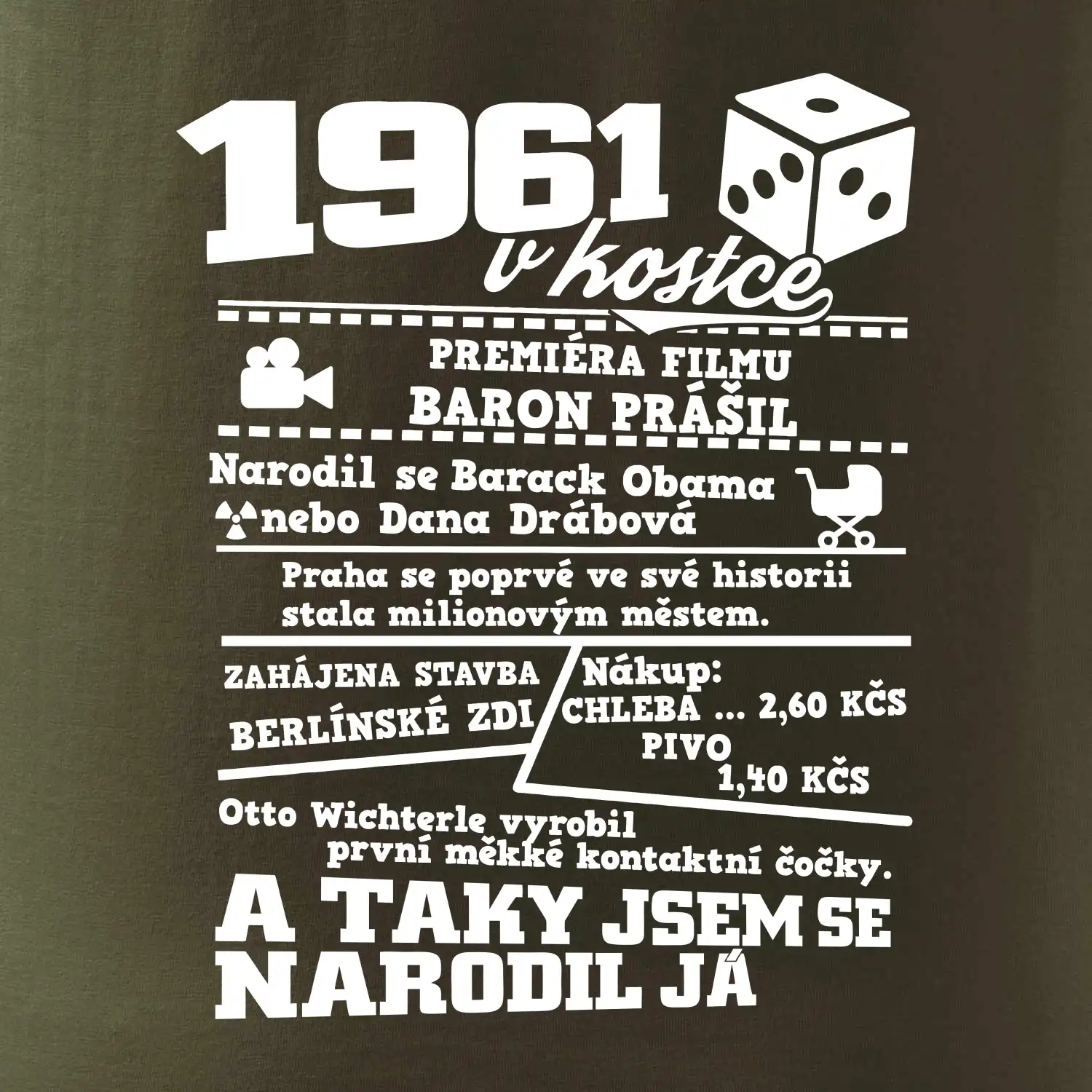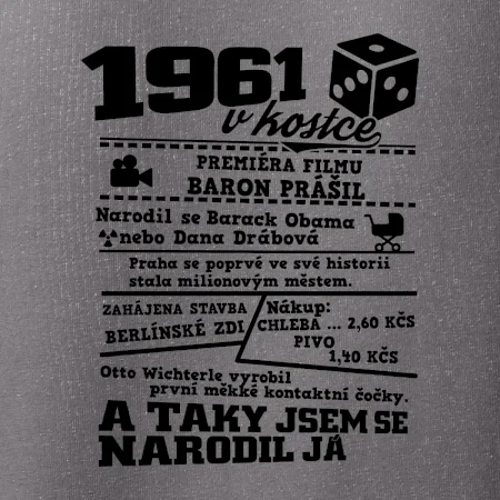 Narozeninové tričko pro ročník 1961. Sháníš originální dárek? Triko pro ročník 1961 v kostce je ten nejlepší dárek, kterým jistě potěšíš. Kolik co stálo? Kdo byl prezident? Kdo se narodil? Všechno tohle a ještě mnohem víc najdeš na našem oslaveneckém triku!