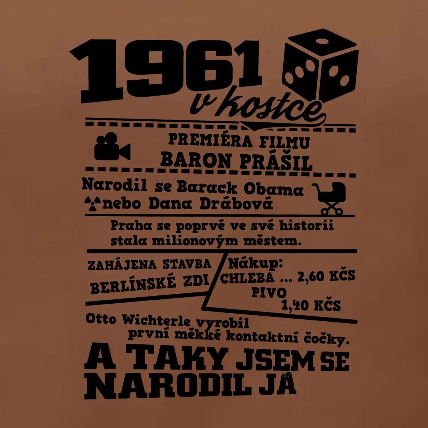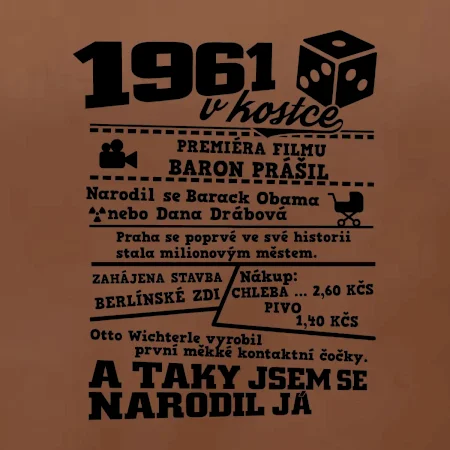 Narozeninové tričko pro ročník 1961. Sháníš originální dárek? Triko pro ročník 1961 v kostce je ten nejlepší dárek, kterým jistě potěšíš. Kolik co stálo? Kdo byl prezident? Kdo se narodil? Všechno tohle a ještě mnohem víc najdeš na našem oslaveneckém triku!