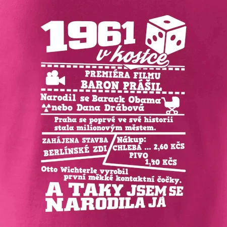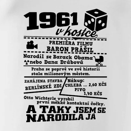Narozeninové tričko pro ročník 1961. Sháníš originální dárek? Triko pro ročník 1961 v kostce je ten nejlepší dárek, kterým jistě potěšíš. Kolik co stálo? Kdo byl prezident? Kdo se narodil? Všechno tohle a ještě mnohem víc najdeš na našem oslaveneckém triku!