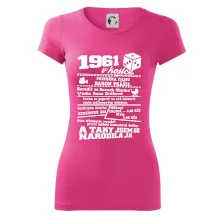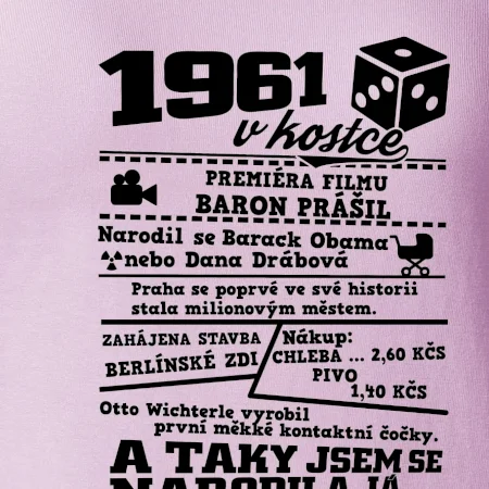 Narozeninové tričko pro ročník 1961. Sháníš originální dárek? Triko pro ročník 1961 v kostce je ten nejlepší dárek, kterým jistě potěšíš. Kolik co stálo? Kdo byl prezident? Kdo se narodil? Všechno tohle a ještě mnohem víc najdeš na našem oslaveneckém triku!