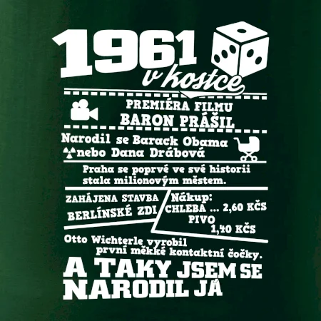 Narozeninové tričko pro ročník 1961. Sháníš originální dárek? Triko pro ročník 1961 v kostce je ten nejlepší dárek, kterým jistě potěšíš. Kolik co stálo? Kdo byl prezident? Kdo se narodil? Všechno tohle a ještě mnohem víc najdeš na našem oslaveneckém triku!