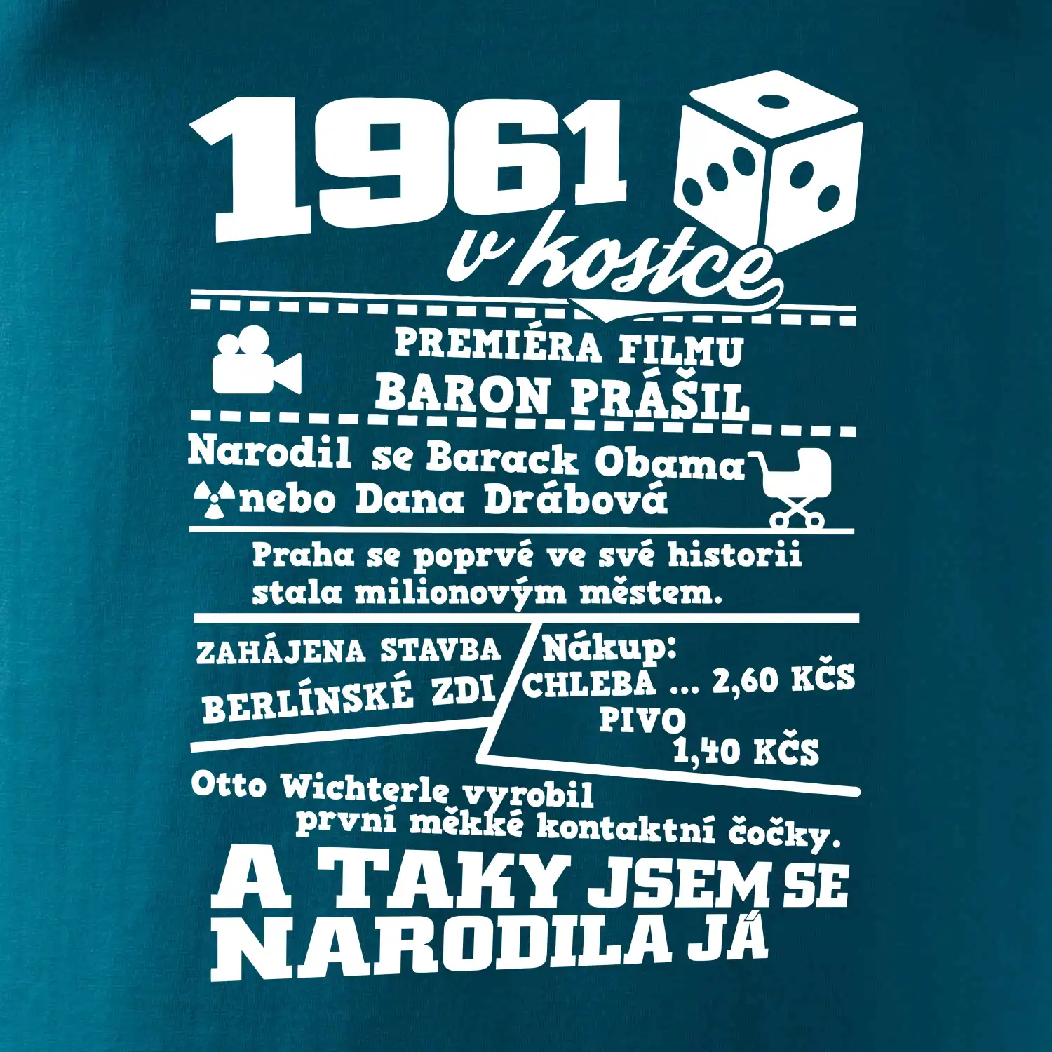 Narozeninové tričko pro ročník 1961. Sháníš originální dárek? Triko pro ročník 1961 v kostce je ten nejlepší dárek, kterým jistě potěšíš. Kolik co stálo? Kdo byl prezident? Kdo se narodil? Všechno tohle a ještě mnohem víc najdeš na našem oslaveneckém triku!
