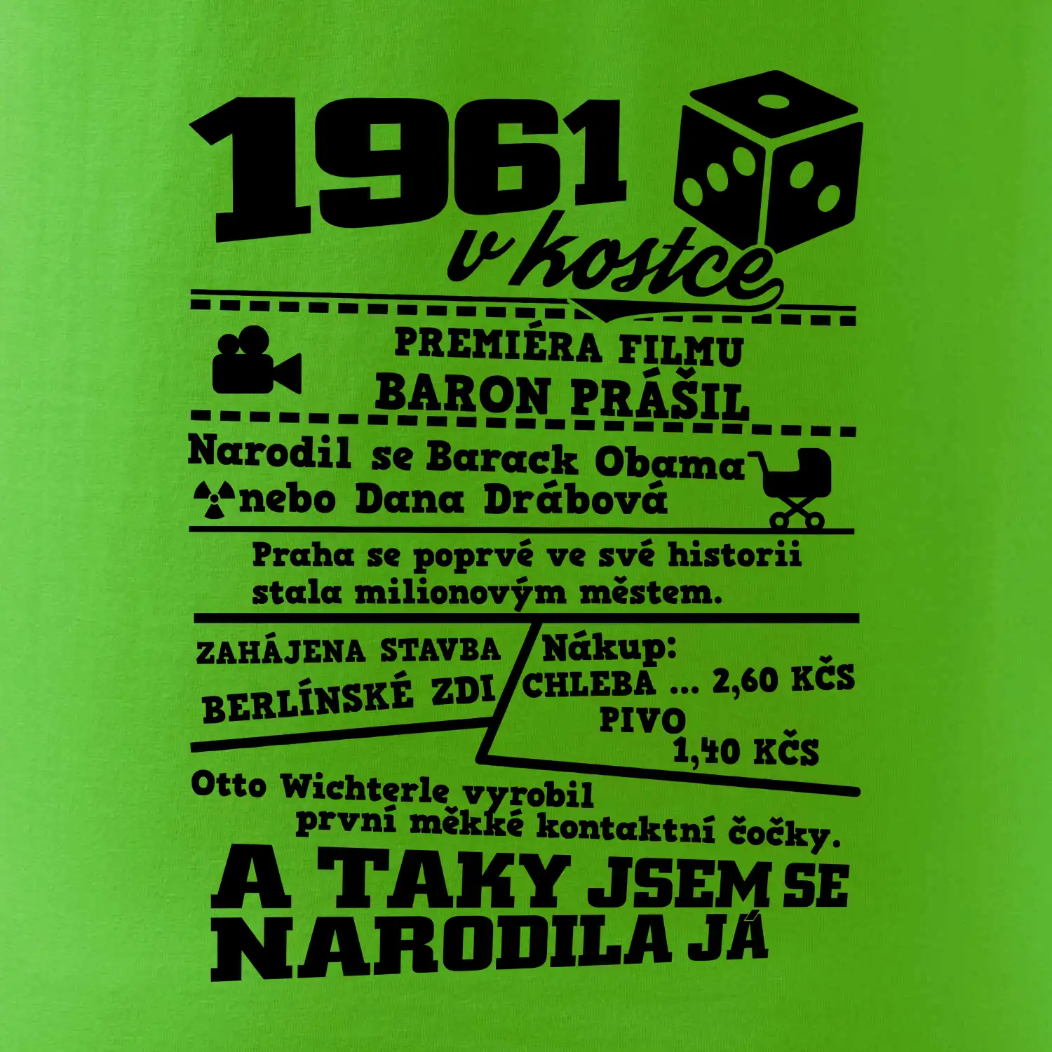 Narozeninové tričko pro ročník 1961. Sháníš originální dárek? Triko pro ročník 1961 v kostce je ten nejlepší dárek, kterým jistě potěšíš. Kolik co stálo? Kdo byl prezident? Kdo se narodil? Všechno tohle a ještě mnohem víc najdeš na našem oslaveneckém triku!