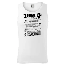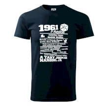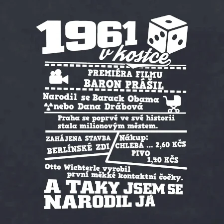Narozeninové tričko pro ročník 1961. Sháníš originální dárek? Triko pro ročník 1961 v kostce je ten nejlepší dárek, kterým jistě potěšíš. Kolik co stálo? Kdo byl prezident? Kdo se narodil? Všechno tohle a ještě mnohem víc najdeš na našem oslaveneckém triku!