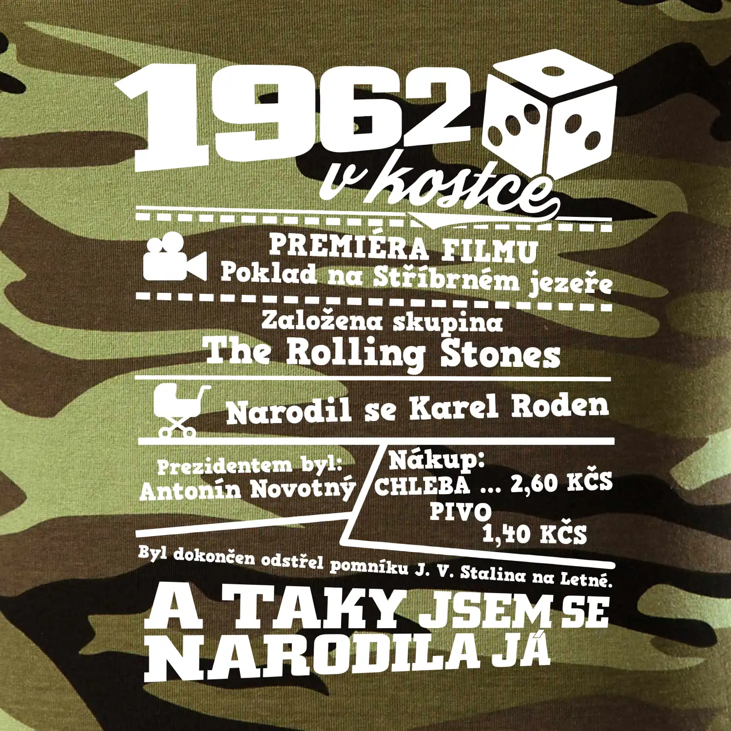 Narozeninové tričko pro ročník 1962. Sháníš originální dárek? Triko pro ročník 1962 v kostce je ten nejlepší dárek, kterým jistě potěšíš. Kolik co stálo? Kdo byl prezident? Kdo se narodil? Všechno tohle a ještě mnohem víc najdeš na našem oslaveneckém triku!