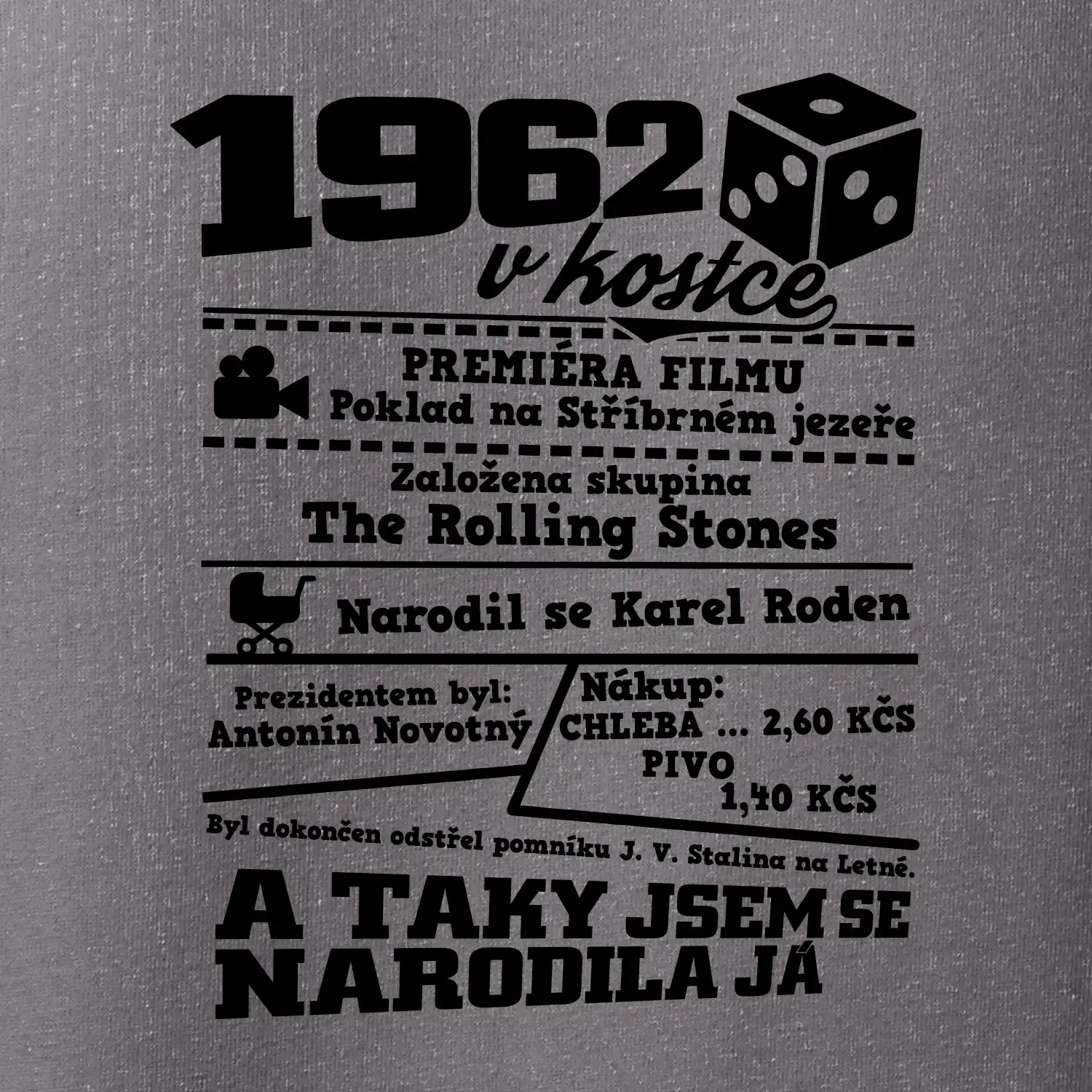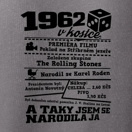 Narozeninové tričko pro ročník 1962. Sháníš originální dárek? Triko pro ročník 1962 v kostce je ten nejlepší dárek, kterým jistě potěšíš. Kolik co stálo? Kdo byl prezident? Kdo se narodil? Všechno tohle a ještě mnohem víc najdeš na našem oslaveneckém triku!