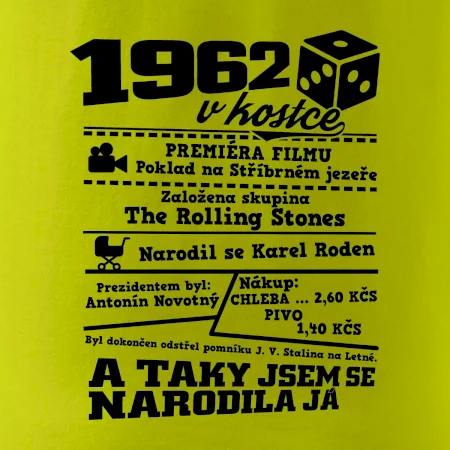 Narozeninové tričko pro ročník 1962. Sháníš originální dárek? Triko pro ročník 1962 v kostce je ten nejlepší dárek, kterým jistě potěšíš. Kolik co stálo? Kdo byl prezident? Kdo se narodil? Všechno tohle a ještě mnohem víc najdeš na našem oslaveneckém triku!