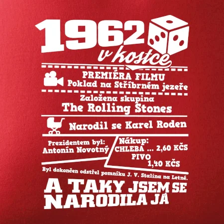 Narozeninové tričko pro ročník 1962. Sháníš originální dárek? Triko pro ročník 1962 v kostce je ten nejlepší dárek, kterým jistě potěšíš. Kolik co stálo? Kdo byl prezident? Kdo se narodil? Všechno tohle a ještě mnohem víc najdeš na našem oslaveneckém triku!