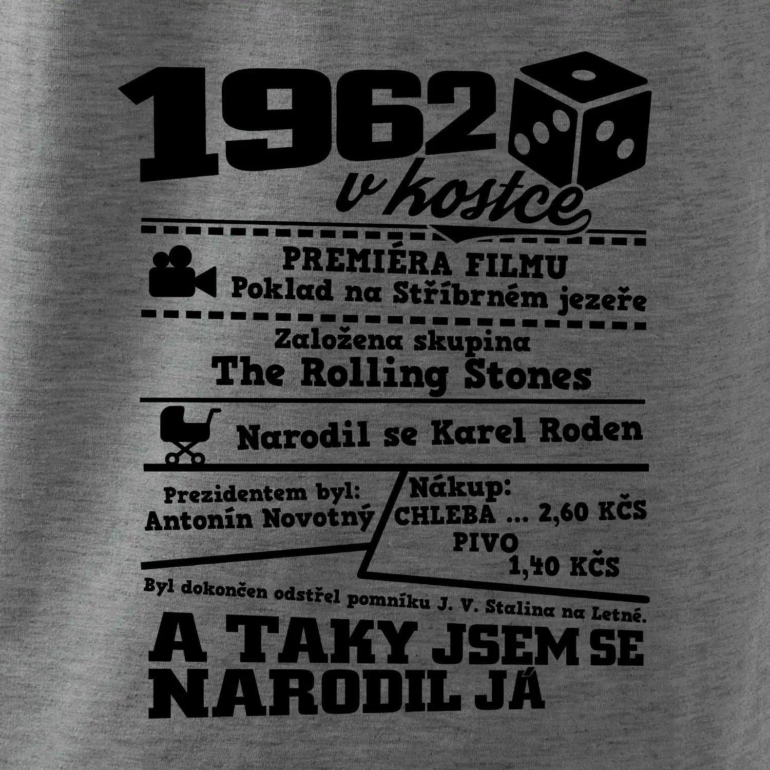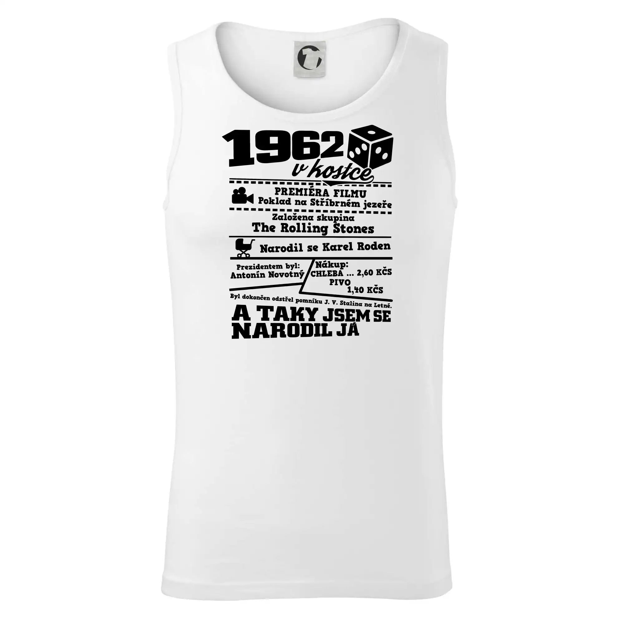 Narozeninové tričko pro ročník 1962. Sháníš originální dárek? Triko pro ročník 1962 v kostce je ten nejlepší dárek, kterým jistě potěšíš. Kolik co stálo? Kdo byl prezident? Kdo se narodil? Všechno tohle a ještě mnohem víc najdeš na našem oslaveneckém triku!