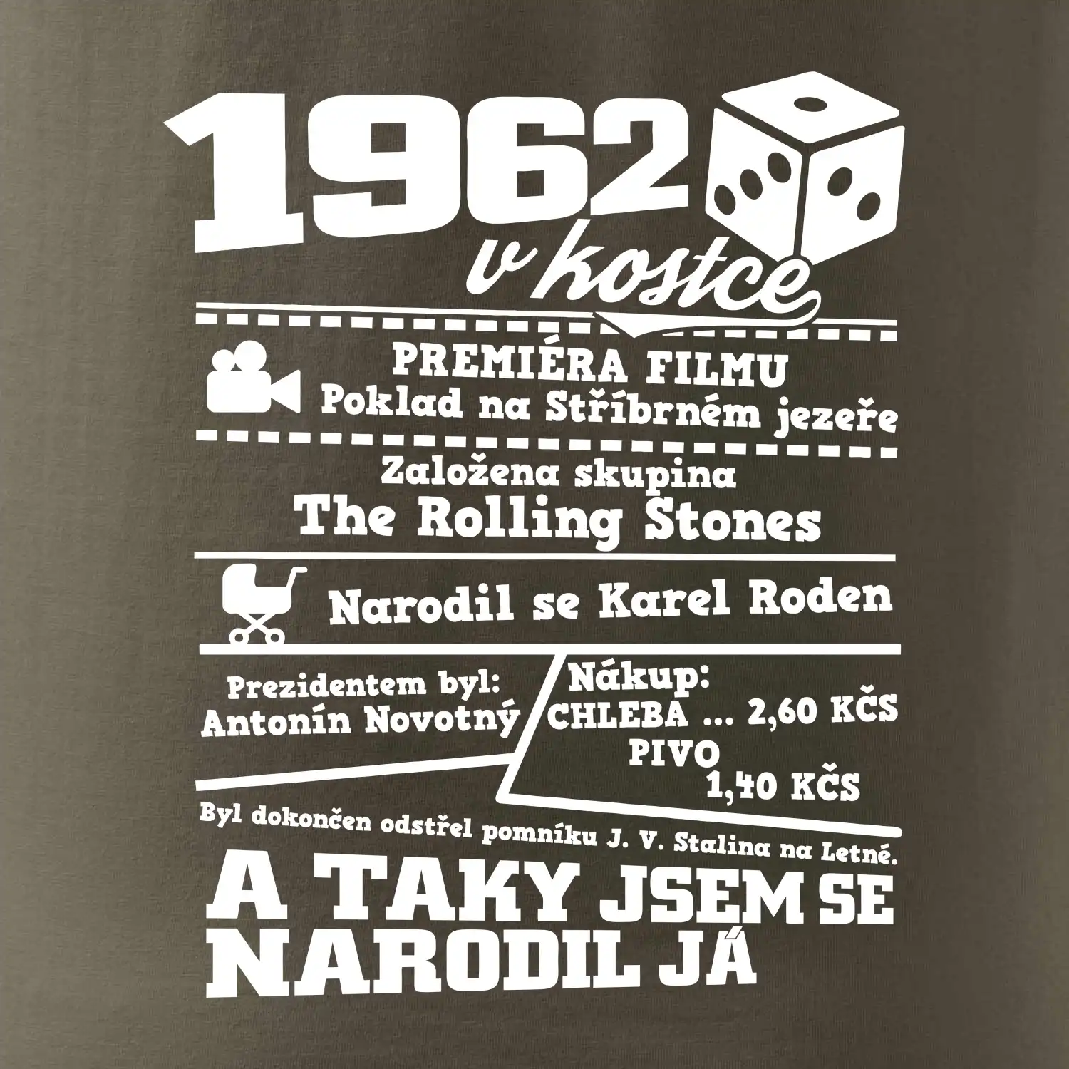 Narozeninové tričko pro ročník 1962. Sháníš originální dárek? Triko pro ročník 1962 v kostce je ten nejlepší dárek, kterým jistě potěšíš. Kolik co stálo? Kdo byl prezident? Kdo se narodil? Všechno tohle a ještě mnohem víc najdeš na našem oslaveneckém triku!