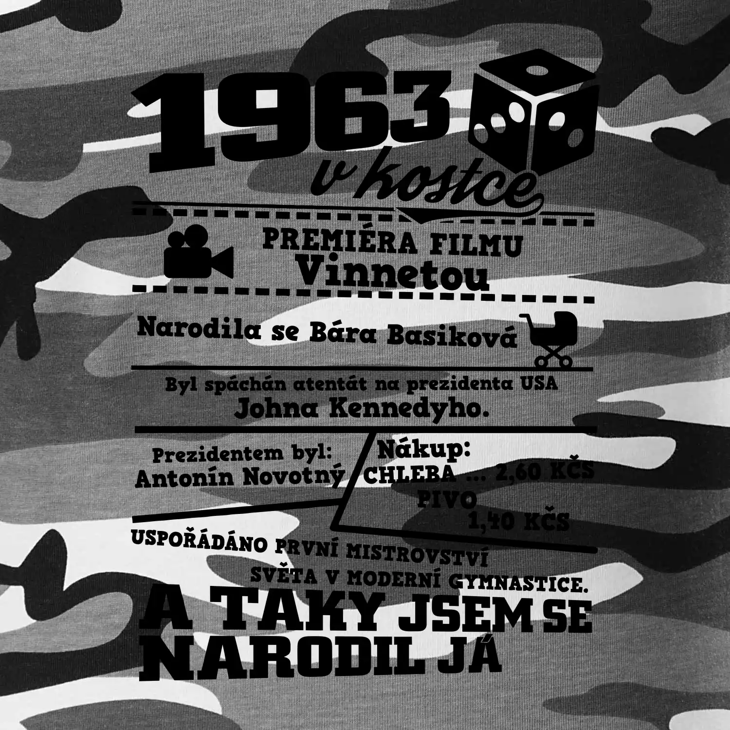 Narozeninové tričko pro ročník 1963. Sháníš originální dárek? Triko pro ročník 1963 v kostce je ten nejlepší dárek, kterým jistě potěšíš. Kolik co stálo? Kdo byl prezident? Kdo se narodil? Všechno tohle a ještě mnohem víc najdeš na našem oslaveneckém triku!
