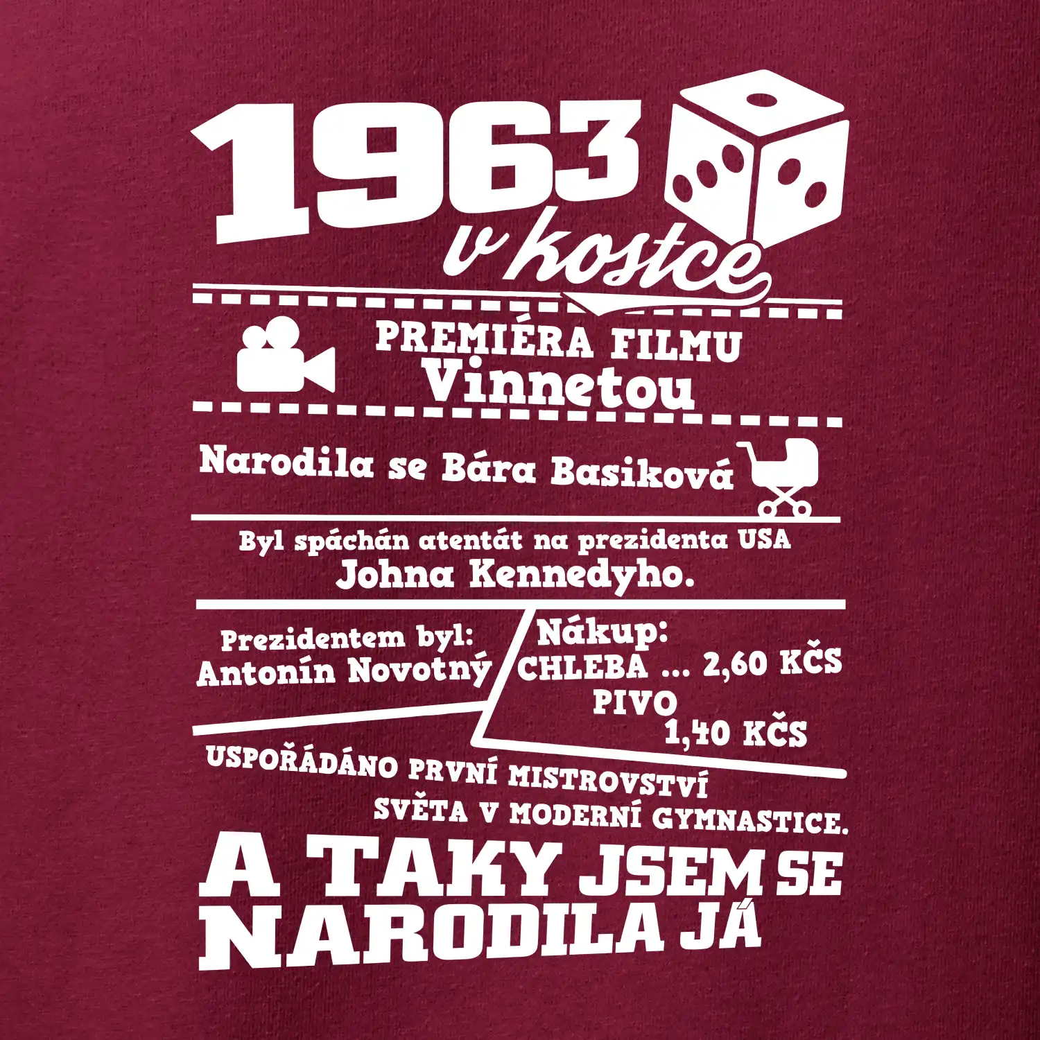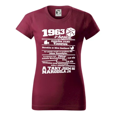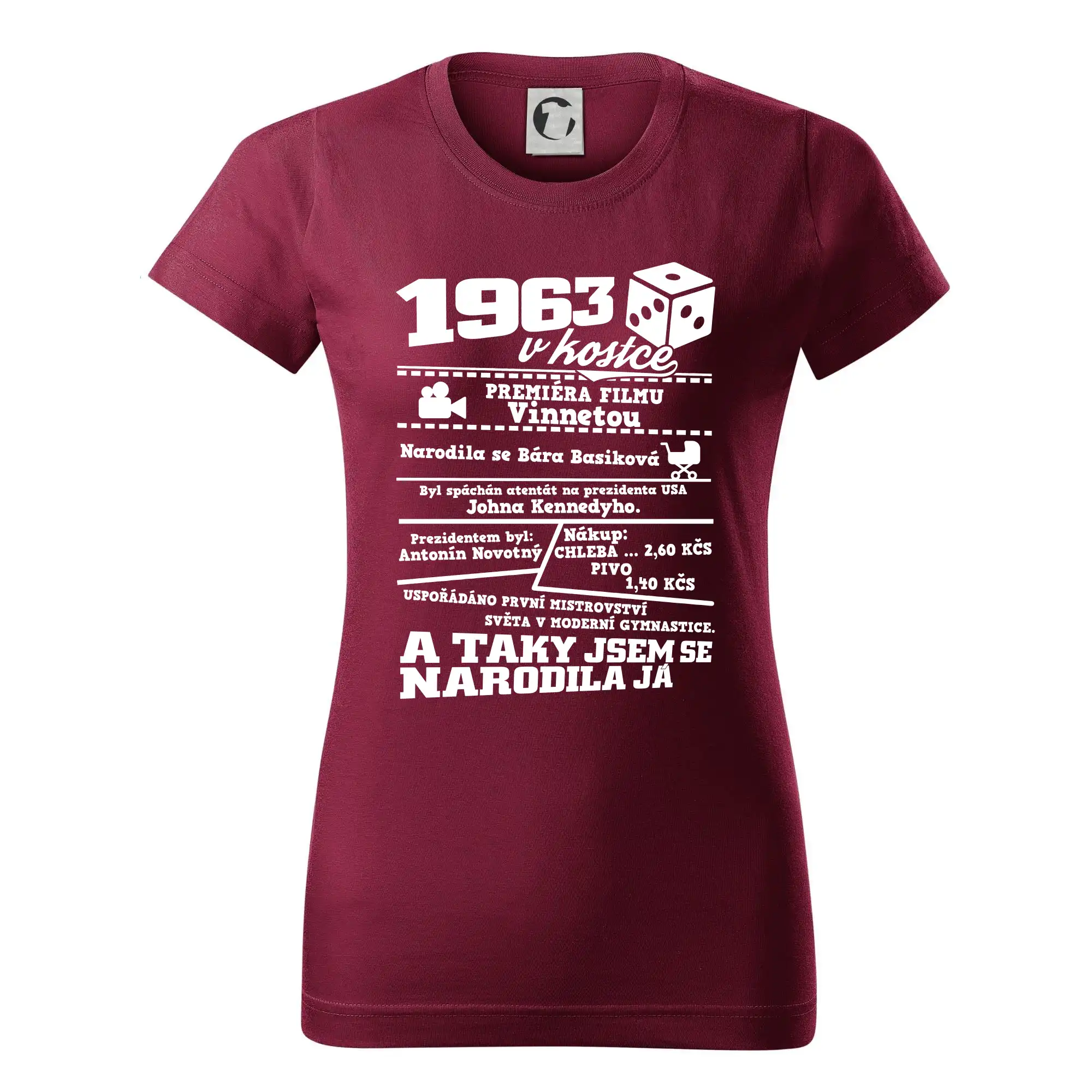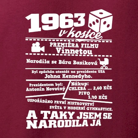 Narozeninové tričko pro ročník 1963. Sháníš originální dárek? Triko pro ročník 1963 v kostce je ten nejlepší dárek, kterým jistě potěšíš. Kolik co stálo? Kdo byl prezident? Kdo se narodil? Všechno tohle a ještě mnohem víc najdeš na našem oslaveneckém triku!