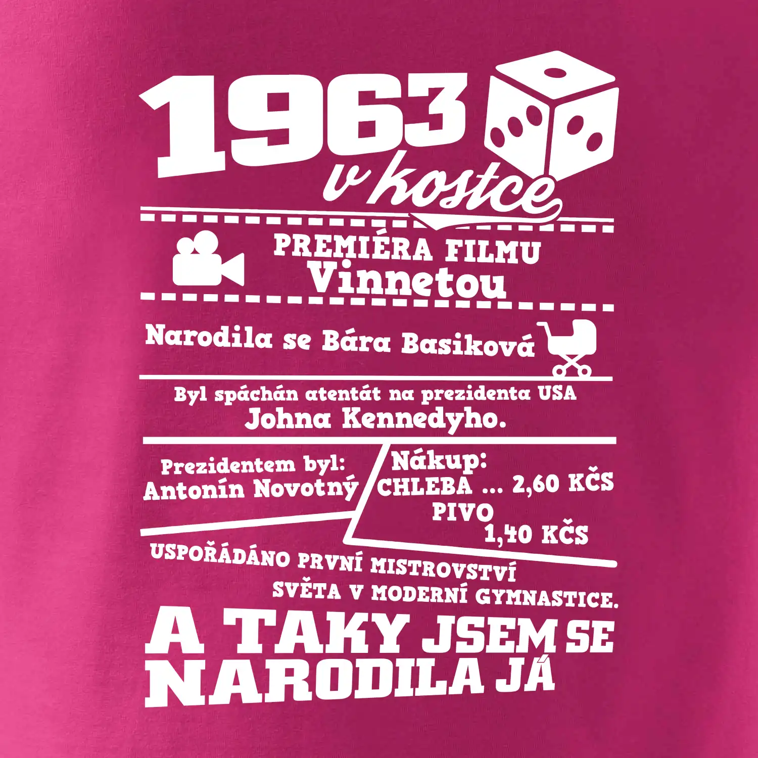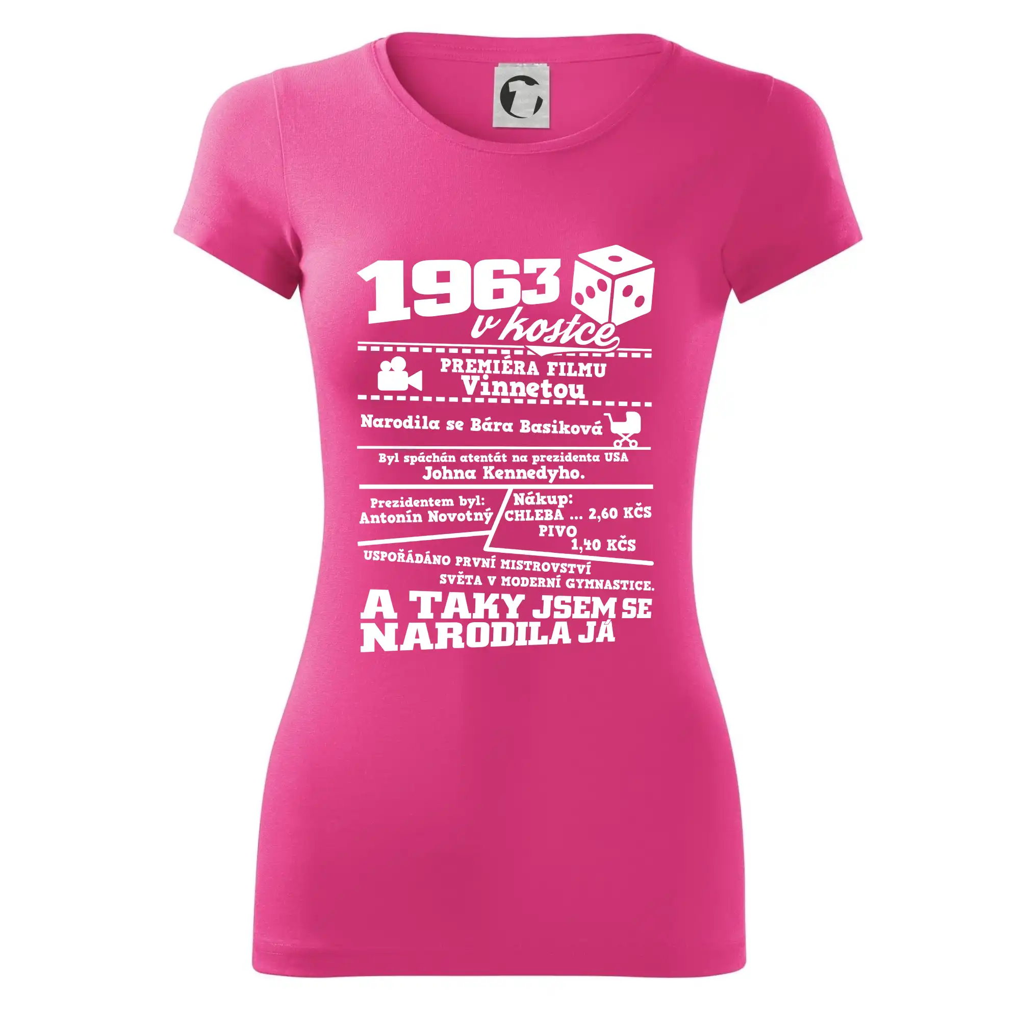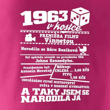 Narozeninové tričko pro ročník 1963. Sháníš originální dárek? Triko pro ročník 1963 v kostce je ten nejlepší dárek, kterým jistě potěšíš. Kolik co stálo? Kdo byl prezident? Kdo se narodil? Všechno tohle a ještě mnohem víc najdeš na našem oslaveneckém triku!