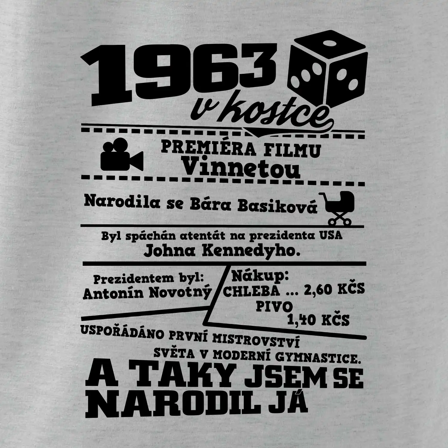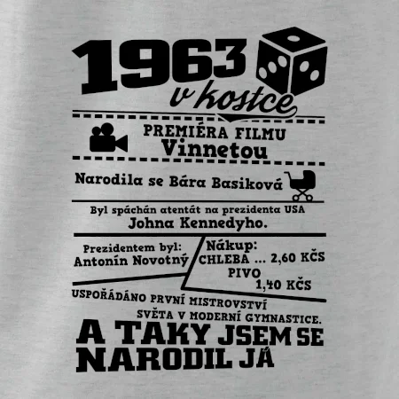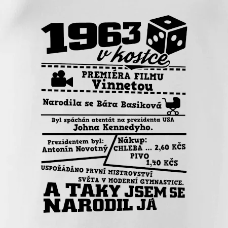 Narozeninové tričko pro ročník 1963. Sháníš originální dárek? Triko pro ročník 1963 v kostce je ten nejlepší dárek, kterým jistě potěšíš. Kolik co stálo? Kdo byl prezident? Kdo se narodil? Všechno tohle a ještě mnohem víc najdeš na našem oslaveneckém triku!