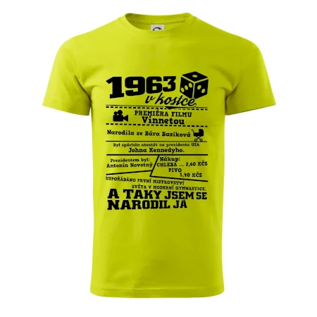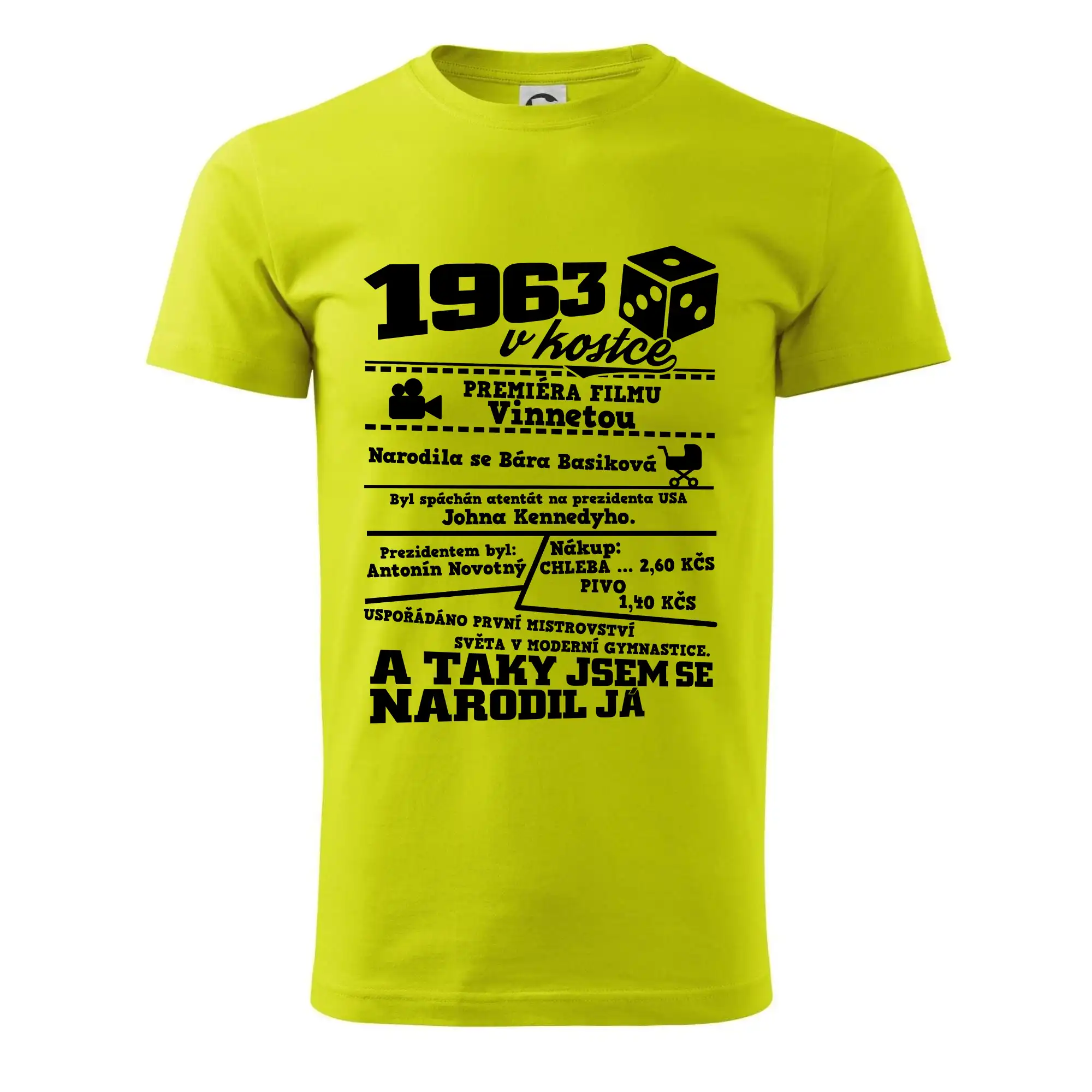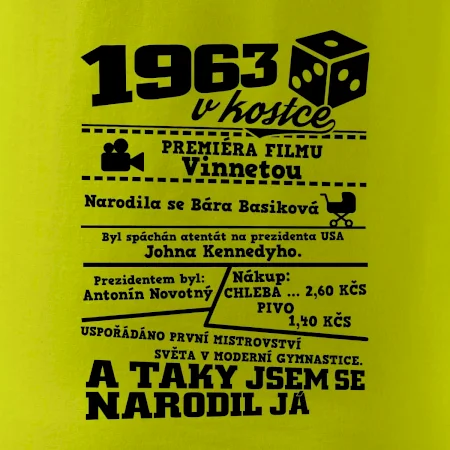 Narozeninové tričko pro ročník 1963. Sháníš originální dárek? Triko pro ročník 1963 v kostce je ten nejlepší dárek, kterým jistě potěšíš. Kolik co stálo? Kdo byl prezident? Kdo se narodil? Všechno tohle a ještě mnohem víc najdeš na našem oslaveneckém triku!