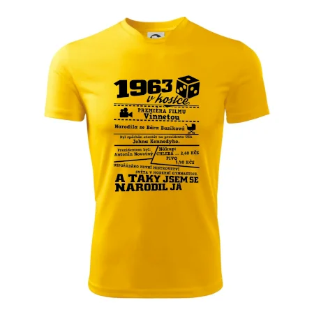 Narozeninové tričko pro ročník 1963. Sháníš originální dárek? Triko pro ročník 1963 v kostce je ten nejlepší dárek, kterým jistě potěšíš. Kolik co stálo? Kdo byl prezident? Kdo se narodil? Všechno tohle a ještě mnohem víc najdeš na našem oslaveneckém triku!
