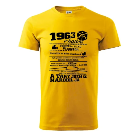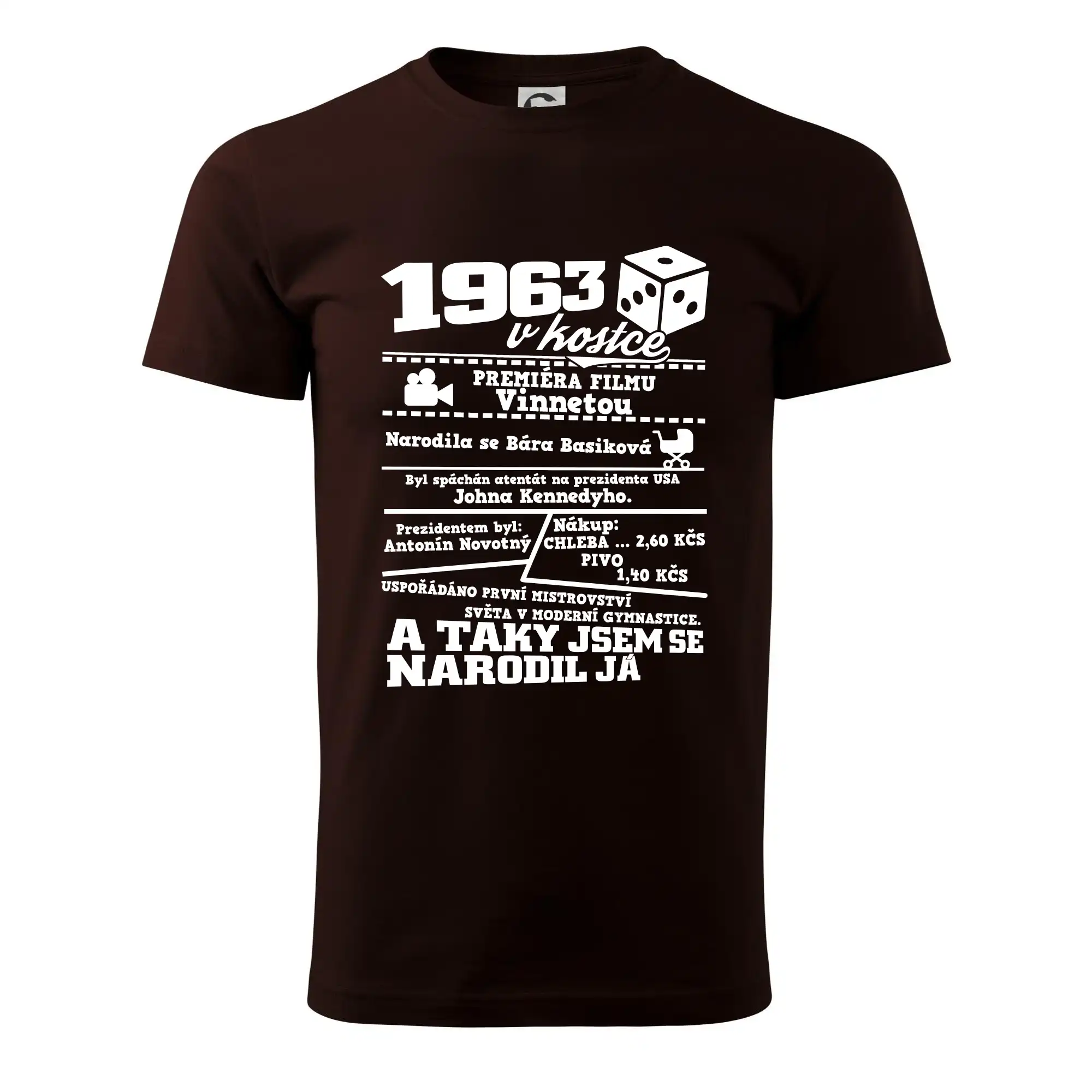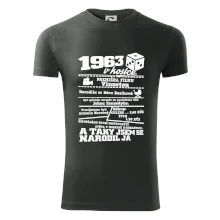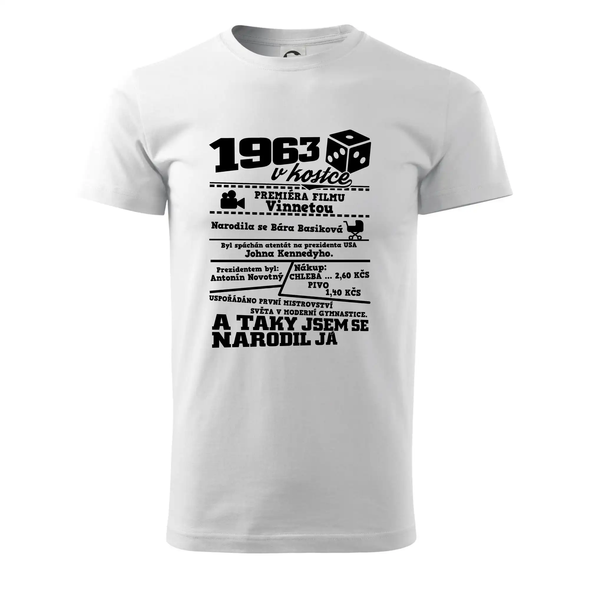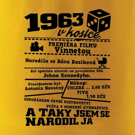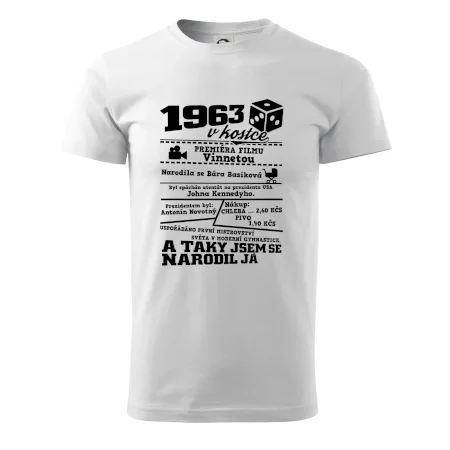 Narozeninové tričko pro ročník 1963. Sháníš originální dárek? Triko pro ročník 1963 v kostce je ten nejlepší dárek, kterým jistě potěšíš. Kolik co stálo? Kdo byl prezident? Kdo se narodil? Všechno tohle a ještě mnohem víc najdeš na našem oslaveneckém triku!