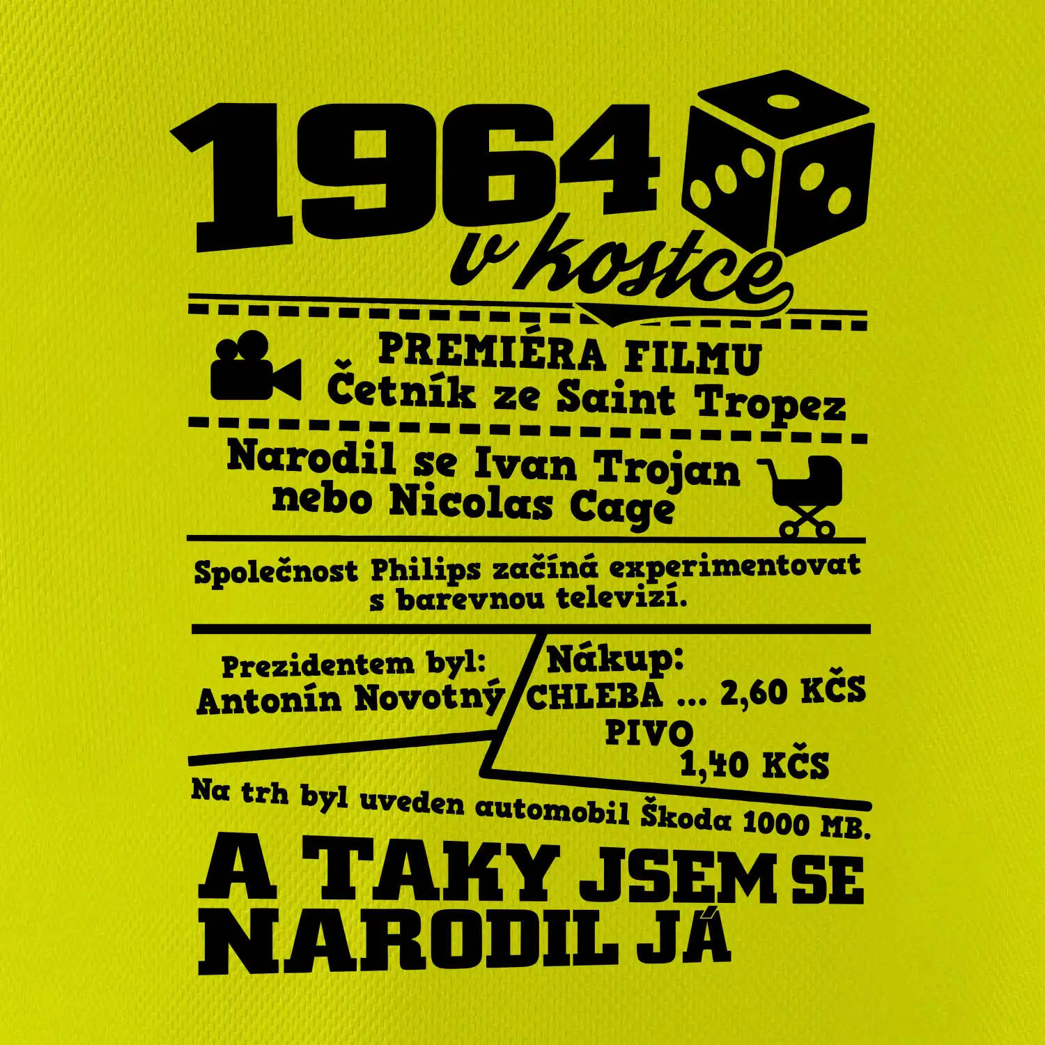 Narozeninové tričko pro ročník 1964. Sháníš originální dárek? Triko pro ročník 1964 v kostce je ten nejlepší dárek, kterým jistě potěšíš. Kolik co stálo? Kdo byl prezident? Kdo se narodil? Všechno tohle a ještě mnohem víc najdeš na našem oslaveneckém triku!