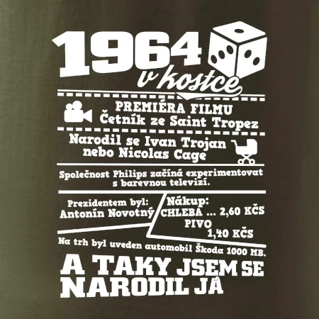 Narozeninové tričko pro ročník 1964. Sháníš originální dárek? Triko pro ročník 1964 v kostce je ten nejlepší dárek, kterým jistě potěšíš. Kolik co stálo? Kdo byl prezident? Kdo se narodil? Všechno tohle a ještě mnohem víc najdeš na našem oslaveneckém triku!