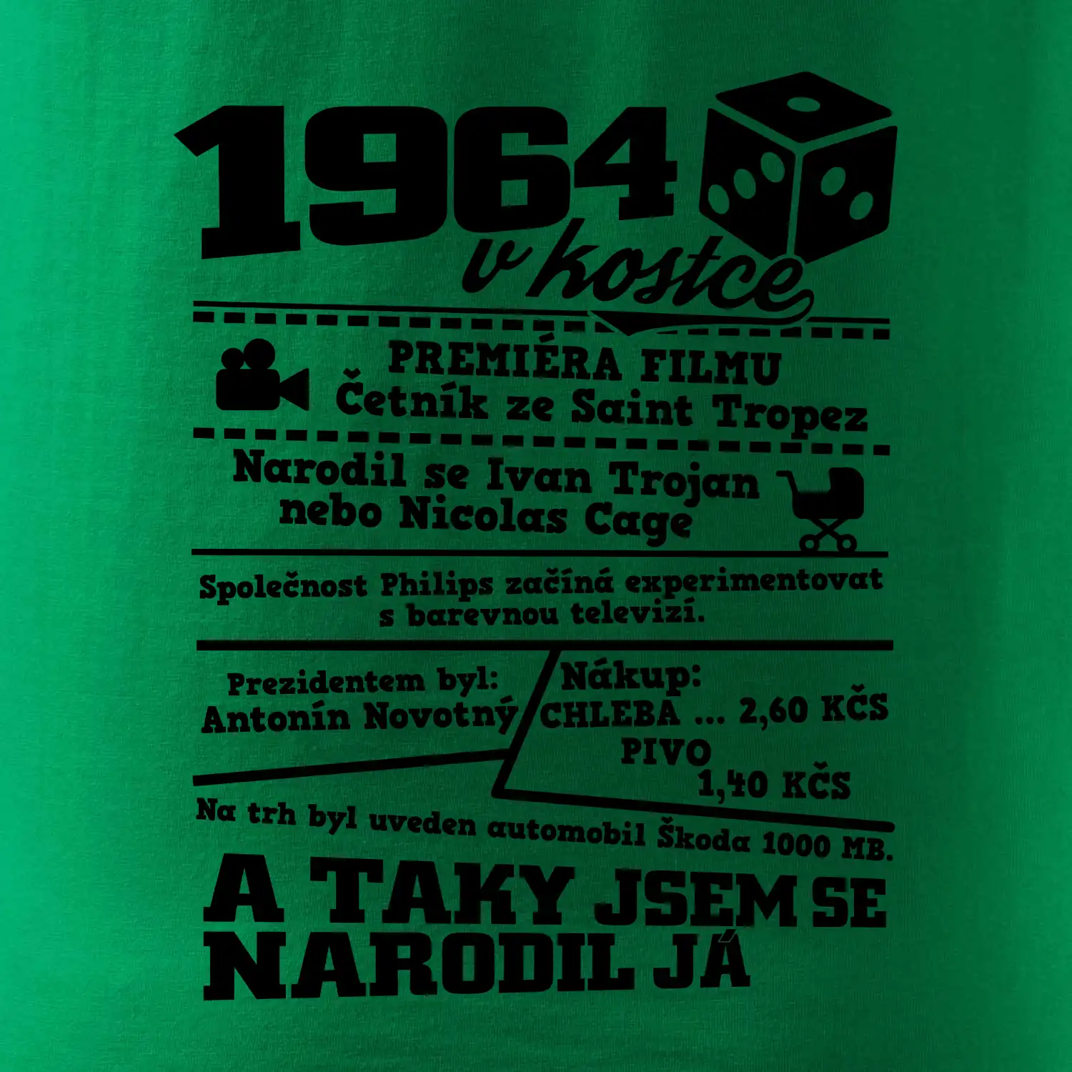 Narozeninové tričko pro ročník 1964. Sháníš originální dárek? Triko pro ročník 1964 v kostce je ten nejlepší dárek, kterým jistě potěšíš. Kolik co stálo? Kdo byl prezident? Kdo se narodil? Všechno tohle a ještě mnohem víc najdeš na našem oslaveneckém triku!