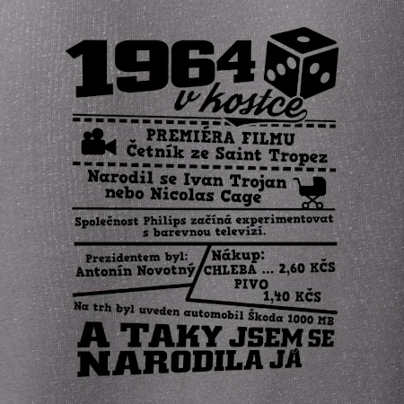 Narozeninové tričko pro ročník 1964. Sháníš originální dárek? Triko pro ročník 1964 v kostce je ten nejlepší dárek, kterým jistě potěšíš. Kolik co stálo? Kdo byl prezident? Kdo se narodil? Všechno tohle a ještě mnohem víc najdeš na našem oslaveneckém triku!