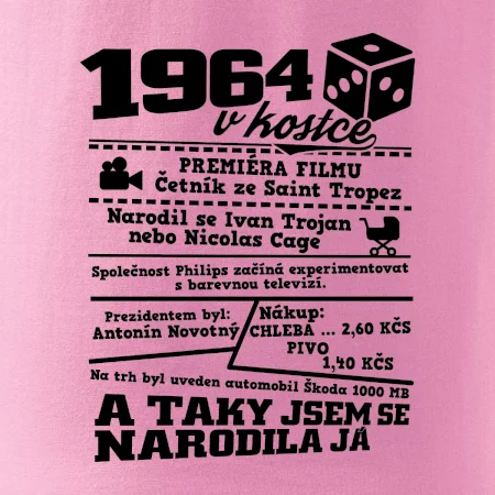 Narozeninové tričko pro ročník 1964. Sháníš originální dárek? Triko pro ročník 1964 v kostce je ten nejlepší dárek, kterým jistě potěšíš. Kolik co stálo? Kdo byl prezident? Kdo se narodil? Všechno tohle a ještě mnohem víc najdeš na našem oslaveneckém triku!